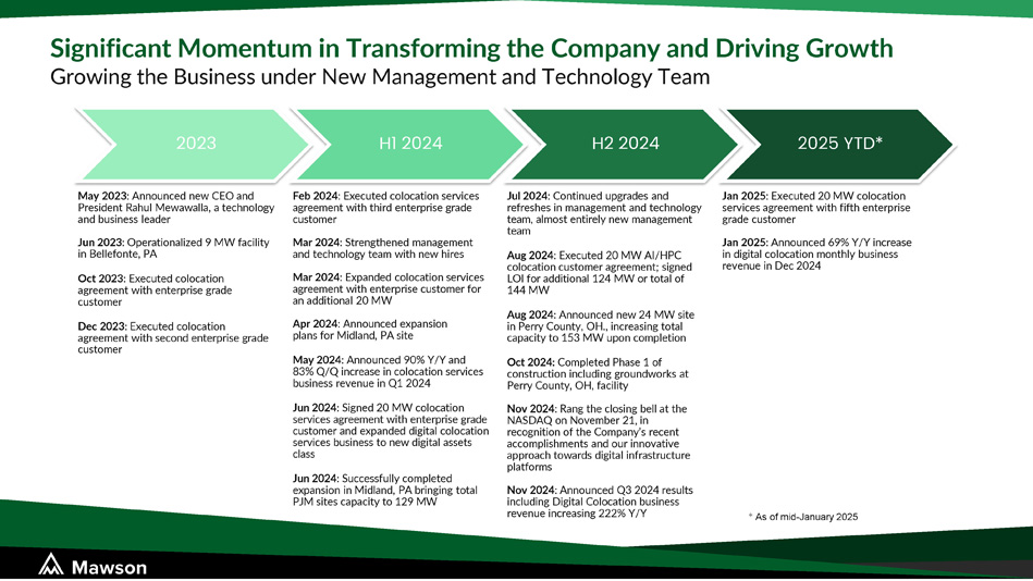 2023 May 2023 : Announced new CEO and President Rahul Mewawalla, a technology and business leader Jun 2023 : Operationalized 9 MW facility in Bellefonte, PA Oct 2023 : Executed colocation agreement with enterprise grade customer Dec 2023 : Executed colocation agreement with second enterprise grade customer H1 2024 Feb 2024 : Executed colocation services agreement with third enterprise grade customer Mar 2024 : Strengthened management and technology team with new hires Mar 2024 : Expanded colocation services agreement with enterprise customer for an additional 20 MW Apr 2024 : Announced expansion plans for Midland, PA site May 2024 : Announced 90% Y/Y and 83% Q/Q increase in colocation services business revenue in Q1 2024 Jun 2024 : Signed 20 MW colocation services agreement with enterprise grade customer and expanded digital colocation services business to new digital assets class Jun 2024 : Successfully completed expansion in Midland, PA bringing total PJM sites capacity to 129 MW H2 2024 2025 YTD* Jan 2025 : Executed 20 MW colocation services agreement with fifth enterprise grade customer Jan 2025 : Announced 69% Y/Y increase in digital colocation monthly business revenue in Dec 2024 Significant Momentum in Transforming the Company and Driving Growth Growing the Business under New Management and Technology Team * As of mid - January 2025 Jul 2024 : Continued upgrades and refreshes in management and technology team, almost entirely new management team Aug 2024 : Executed 20 MW AI/HPC colocation customer agreement; signed LOI for additional 124 MW or total of 144 MW Aug 2024 : Announced new 24 MW site in Perry County, OH., increasing total capacity to 153 MW upon completion Oct 2024: Completed Phase 1 of construction including groundworks at Perry County, OH, facility Nov 2024 : Rang the closing bell at the NASDAQ on November 21, in recognition of the Company’s recent accomplishments and our innovative approach towards digital infrastructure platforms Nov 2024 : Announced Q3 2024 results including Digital Colocation business revenue increasing 222% Y/Y