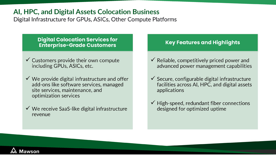 Digital Colocation Services for Enterprise - Grade Customers x Customers provide their own compute including GPUs, ASICs, etc. x We provide digital infrastructure and offer add - ons like software services, managed site services, maintenance, and optimization services x We receive SaaS - like digital infrastructure revenue Key Features and Highlights x Reliable, competitively priced power and advanced power management capabilities x Secure, configurable digital infrastructure facilities across AI, HPC, and digital assets applications x High - speed, redundant fiber connections designed for optimized uptime AI, HPC, and Digital Assets Colocation Business Digital Infrastructure for GPUs, ASICs, Other Compute Platforms