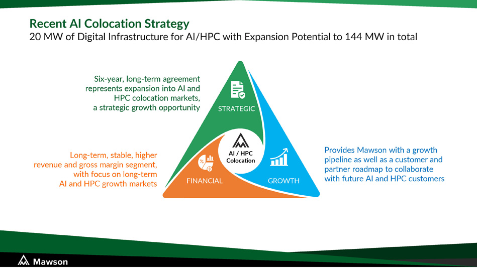 Recent AI Colocation Strategy 20 MW of Digital Infrastructure for AI/HPC with Expansion Potential to 144 MW in total GROWTH FINANCIAL STRATEGIC Provides Mawson with a growth pipeline as well as a customer and partner roadmap to collaborate with future AI and HPC customers Long - term, stable, higher revenue and gross margin segment, with focus on long - term AI and HPC growth markets Six - year, long - term agreement represents expansion into AI and HPC colocation markets, a strategic growth opportunity AI / HPC Colocation