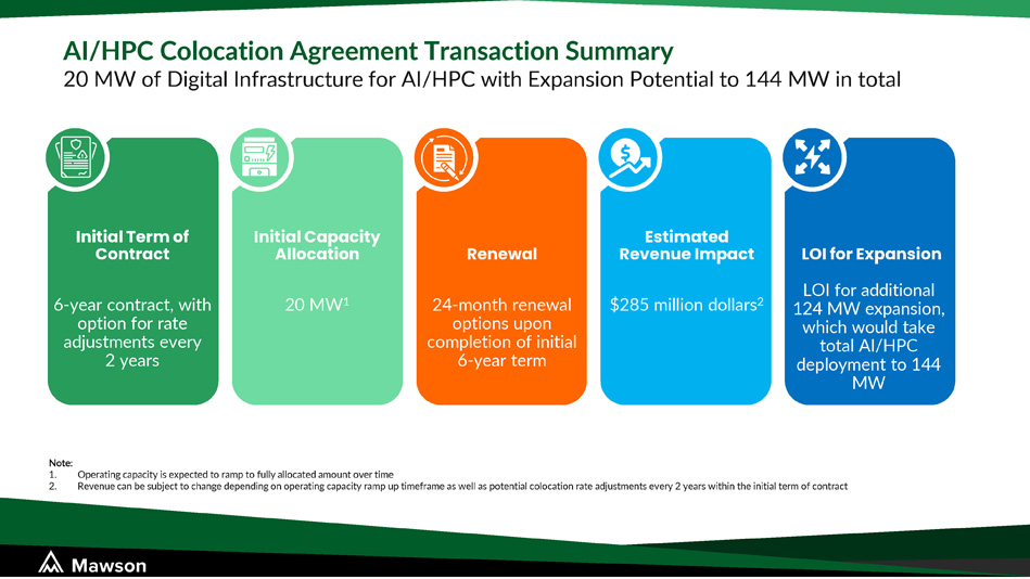 AI/HPC Colocation Agreement Transaction Summary 20 MW of Digital Infrastructure for AI/HPC with Expansion Potential to 144 MW in total Note : 1. Operating capacity is expected to ramp to fully allocated amount over time 2. Revenue can be subject to change depending on operating capacity ramp up timeframe as well as potential colocation rate adjustments every 2 years within the initial term of contract Initial Term of Contract 6 - year contract, with option for rate adjustments every 2 years Initial Capacity Allocation 20 MW 1 Renewal 24 - month renewal options upon completion of initial 6 - year term Estimated Revenue Impact $285 million dollars 2 LOI for Expansion LOI for additional 124 MW expansion, which would take total AI/HPC deployment to 144 MW