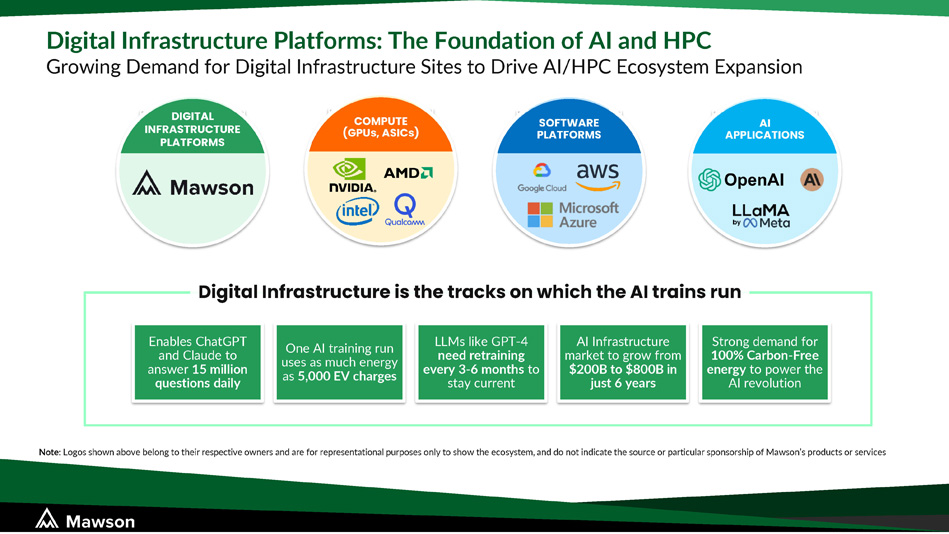 Digital Infrastructure Platforms: The Foundation of AI and HPC Growing Demand for Digital Infrastructure Sites to Drive AI/HPC Ecosystem Expansion P O W E R D G I G E I N T A E R L A T I ON INFRASTRUCTURE PLATFORMS POWER GENERATION COMPUTE (GPUs, ASICs) POWER GENERATION SOFTWARE PLATFORMS POWER GENERATION AI APPLICATIONS Enables ChatGPT and Claude to answer 15 million questions daily One AI training run uses as much energy as 5,000 EV charges LLMs like GPT - 4 need retraining every 3 - 6 months to stay current AI Infrastructure market to grow from $200B to $800B in just 6 years Strong demand for 100% Carbon - Free energy to power the AI revolution Digital Infrastructure is the tracks on which the AI trains run Note : Logos shown above belong to their respective owners and are for representational purposes only to show the ecosystem, and do not indicate the source or particular sponsorship of Mawson’s products or services