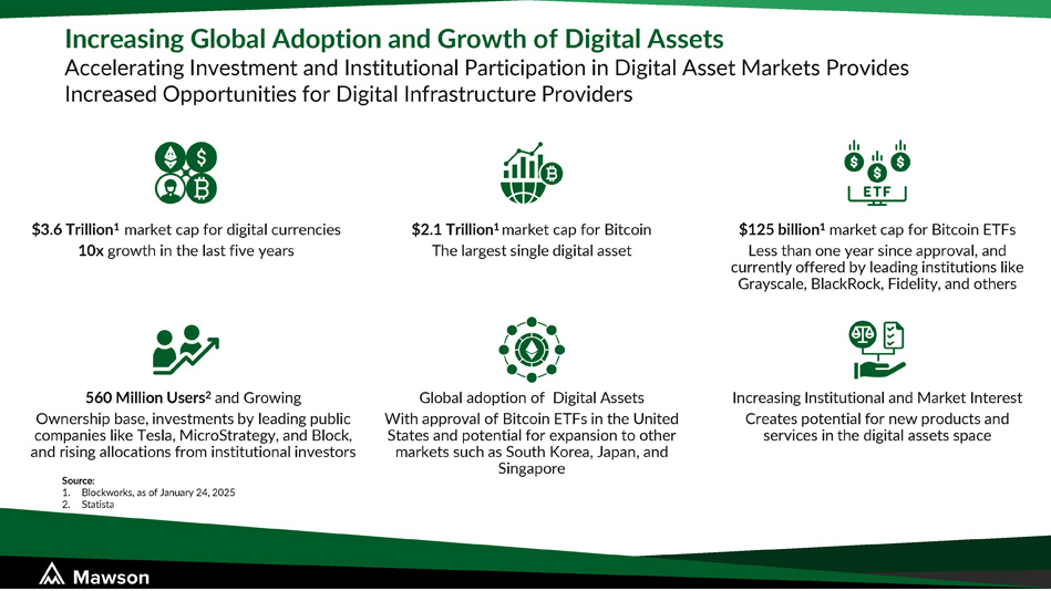 Increasing Global Adoption and Growth of Digital Assets Accelerating Investment and Institutional Participation in Digital Asset Markets Provides Increased Opportunities for Digital Infrastructure Providers 560 Million Users 2 and Growing Ownership base, investments by leading public companies like Tesla, MicroStrategy, and Block, and rising allocations from institutional investors Source : 1. Blockworks, as of January 24, 2025 2. Statista $2.1 Trillion 1 market cap for Bitcoin The largest single digital asset $3.6 Trillion 1 market cap for digital currencies 10x growth in the last five years $125 billion 1 market cap for Bitcoin ETFs Less than one year since approval, and currently offered by leading institutions like Grayscale, BlackRock, Fidelity, and others Global adoption of Digital Assets With approval of Bitcoin ETFs in the United States and potential for expansion to other markets such as South Korea, Japan, and Singapore Increasing Institutional and Market Interest Creates potential for new products and services in the digital assets space