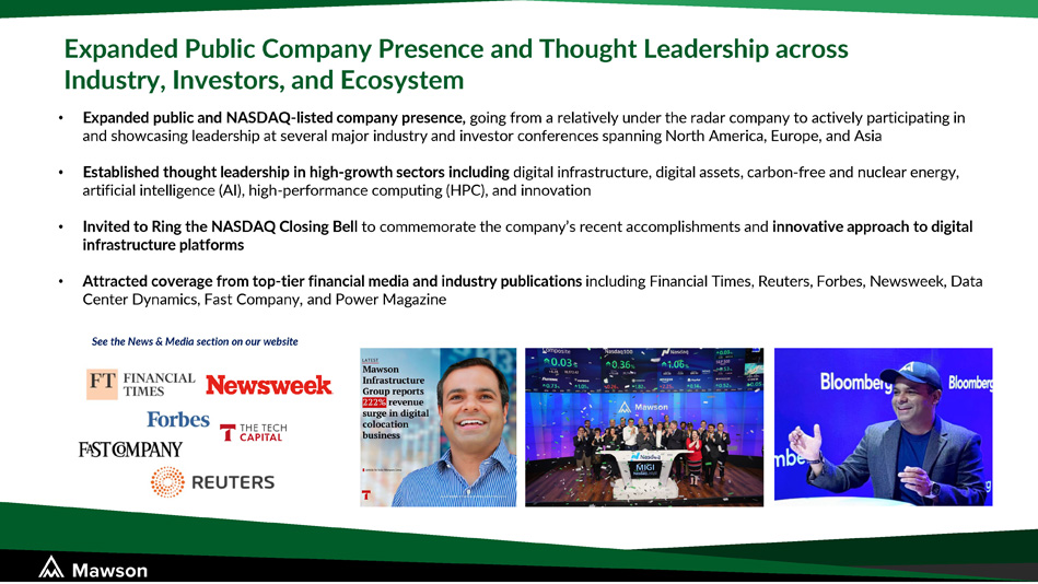 Expanded Public Company Presence and Thought Leadership across Industry, Investors, and Ecosystem • Expanded public and NASDAQ - listed company presence, going from a relatively under the radar company to actively participating in and showcasing leadership at several major industry and investor conferences spanning North America, Europe, and Asia • Established thought leadership in high - growth sectors including digital infrastructure, digital assets, carbon - free and nuclear energy, artificial intelligence (AI), high - performance computing (HPC), and innovation • Invited to Ring the NASDAQ Closing Bell to commemorate the company’s recent accomplishments and innovative approach to digital infrastructure platforms • Attracted coverage from top - tier financial media and industry publications including Financial Times, Reuters, Forbes, Newsweek, Data Center Dynamics, Fast Company, and Power Magazine See the News & Media section on our website