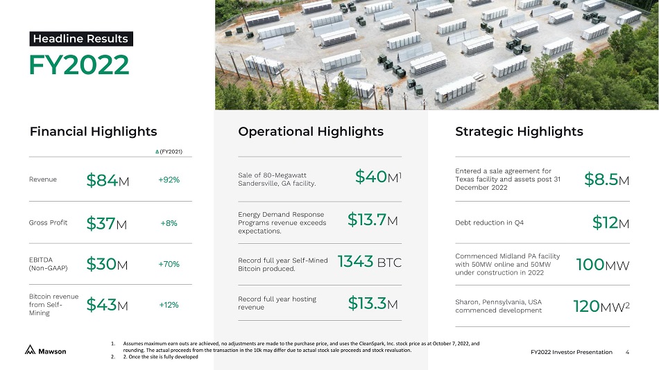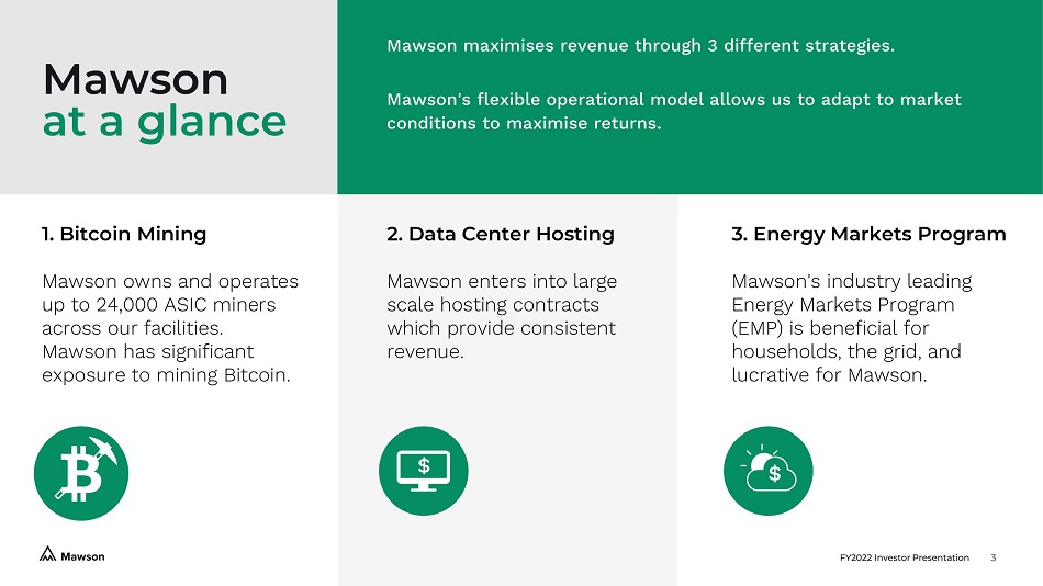 FY2022 Investor Presentation 3 Mawson maximises revenue through 3 different strategies. Mawson's flexible operational model allows us to adapt to market conditions to maximise returns. Mawson at a glance 1. Bitcoin Mining Mawson owns and operates up to 24,000 ASIC miners across our facilities. Mawson has significant exposure to mining Bitcoin. 2. Data Center Hosting Mawson enters into large scale hosting contracts which provide consistent revenue. 3. Energy Markets Program Mawson's industry leading Energy Markets Program (EMP) is beneficial for households, the grid, and lucrative for Mawson.