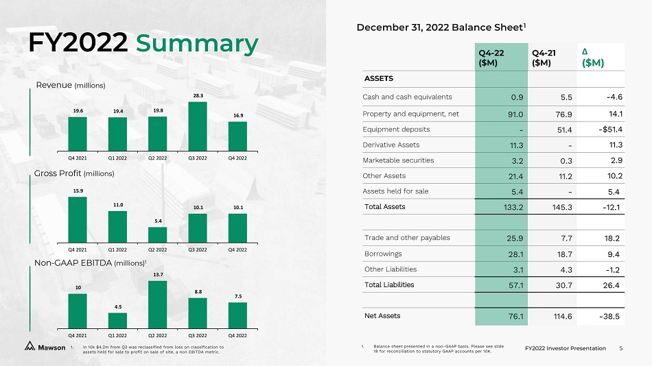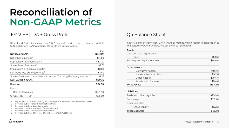 FY2022 Investor Presentation 16 Reconciliation of Non - GAAP Metrics Q4 Balance Sheet Net loss (GAAP) ($54.04) Net other expenses 1 $11.90 Depreciation & amortisation 2 $63.20 Share Based Payments 3 $3.01 Impairment of financial assets 4 $3.38 Fair value loss on investments 5 $1.69 Share of net loss of associates accounted for using the equity method 6 $1.25 EBITDA (Non - GAAP) $30.39 1. Adjustments for – non - operating (income)/expense and Unrealized and realized losses. 2. Reverses out accelerated depreciation effect 3. Reverses out share - based payments 4. Reverses out the impairment of financial assets. 5. Reverses out fair value loss on investments 6. Reverses out share of net loss of equity accounted investments FY22 EBITDA + Gross Profit Slide 4 and 5 identifies some non - GAAP financial metrics, which require reconciliation to the statutory GAAP numbers. We set them out as follows: Slide 5 identifies some non - GAAP financial metrics, which require reconciliation to the statutory GAAP numbers. We set them out as follows: Revenue $84.39 Less Cost of Revenues ($47.70) GROSS PROFIT (GP) $36.69 Assets Cash and cash equivalents Cash $0.9M Property and equipment, net $91.0M Other Assets Derivative Assets $11.3M Marketable securities $3.2M Other Assets $21.4M Assets held for sale $5.4M Total Assets $133.2M Liabilities Trade and other payables $25.9M Borrowings $28.1M Other Liabilities Lease liability $3.1M Total Liabilities $57.1M $M