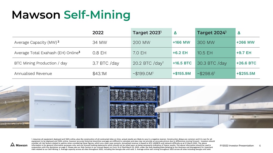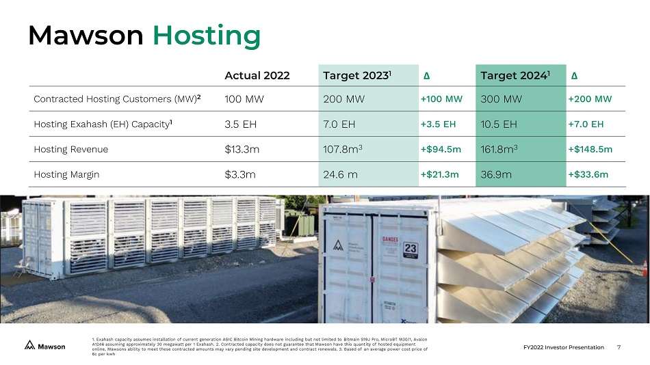 FY2022 Investor Presentation 6 1. Assumes all equipment deployed and 100% online, plus the construction of all contracted sites on time, actual results are lik ely to vary in a negative manner. Construction delays are common and it is rare for all equipment to be deployed and 100% online, however accurate historical downtime averages are difficult to calculate and also may not provide an accurate picture due to differences moving forward. Investors should consider all risk factors related to uptime when considering these figures, which are a best case scenario. Annualised revenue i s based on BTC USD$27k and network difficulty as at 21 March 2023. The above information is for general information purposes only, and are forward looking statements which should not be relied upon as bein g necessarily indicative of future results. The above information should be read in conjunction with the disclaimer on page 2. Please see our Risk Factors in our Annual Report on Form 10 - K filed March 23, 2023, u nder the Sub - Heading Risks Relating to Our Business and Management for important risks related to our Self - Mining. 2. Average capacity across all sites throughout 2022, including the Georgia site until sold. 3 . Average online self mining throughout 2022 across all sites including Georgia until sold. Mawson Self - Mining 2022 Target 2023 1 Δ Target 2024 1 Δ Average Capacity (MW) 2 34 MW 200 MW +166 MW 300 MW +266 MW Average Total Exahash (EH) Online 3 0.8 E H 7.0 EH +6.2 EH 10.5 EH +9.7 EH BTC Mining Production / day 3.7 BTC /day 20.2 BTC /day 1 +16.5 BTC 30.3 BTC /day +26.6 BTC Annualised Revenue $43.1M ~$199.0M 1 +$155.9M ~$298.6 1 +$255.5M