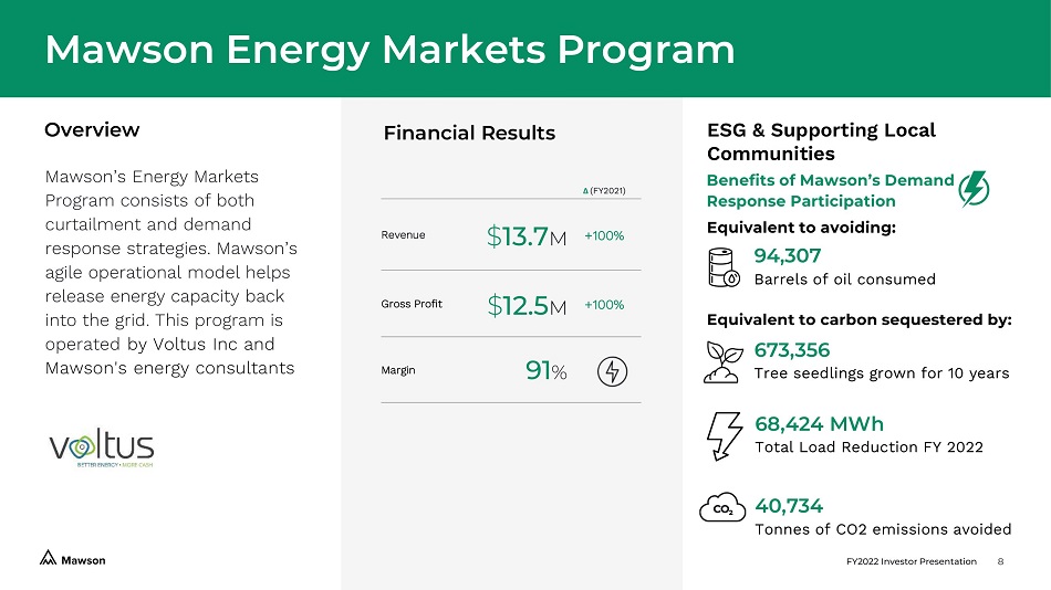 FY2022 Investor Presentation 7 Mawson Hosting Actual 2022 Target 2023 1 Δ Target 2024 1 Δ Contracted Hosting Customers (MW) 2 100 MW 200 MW +100 MW 300 MW +200 MW Hosting Exahash (EH) Capacity 1 3.5 EH 7.0 EH +3.5 EH 10.5 EH +7.0 EH Hosting Revenue $13.3m 107.8m 3 +$94.5m 161.8m 3 +$148.5m Hosting Margin $3.3m 24.6 m +$21.3m 36.9m +$33.6m 1. Exahash capacity assumes installation of current generation ASIC Bitcoin Mining hardware including but not limited to Bitmain S19J Pro, MicroBT M30/1, Avalon A1246 assuming approximately 30 megawatt per 1 Exahash. 2. Contracted capacity does not guarantee that Mawson have this quant ity of hosted equipment online, Mawsons ability to meet these contracted amounts may vary pending site development and contract renewals. 3. Based of an average power cost price of 6c per kwh