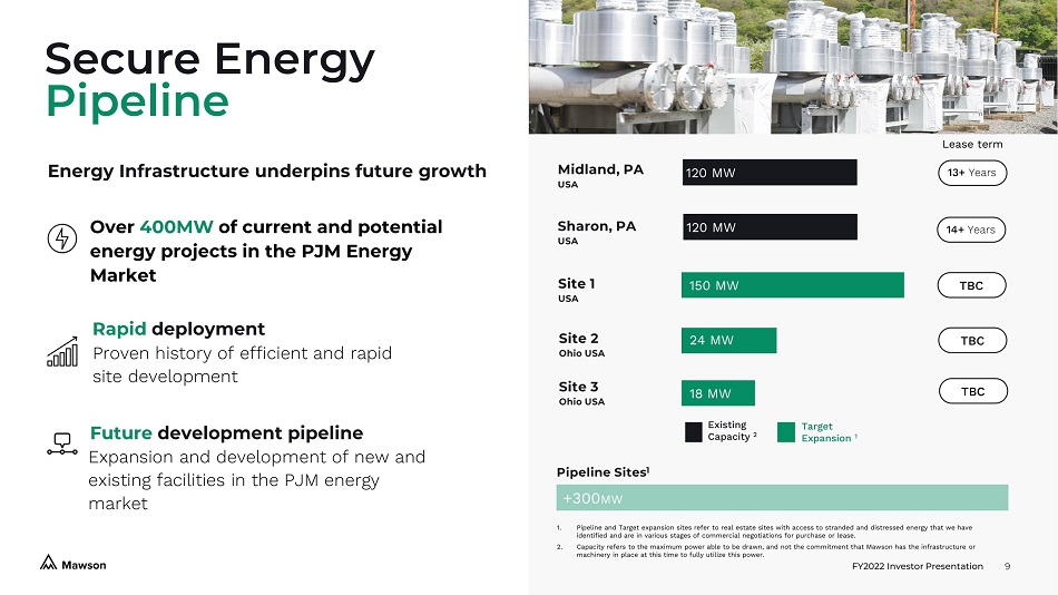 FY2022 Investor Presentation 9 Midland, PA USA Secure Energy Pipeline Energy Infrastructure underpins future growth Proven history of efficient and rapid site development Expansion and development of new and existing facilities in the PJM energy market Future development pipeline Over 400MW of current and potential energy projects in the PJM Energy Market Pipeline Sites 1 +300 MW 13+ Years Lease term 1. Pipeline and Target expansion sites refer to real estate sites with access to stranded and distressed energy that we have identified and are in various stages of commercial negotiations for purchase or lease. 2. Capacity refers to the maximum power able to be drawn, and not the commitment that Mawson has the infrastructure or machinery in place at this time to fully utilize this power. Sharon, PA USA 14+ Years Existing Capacity 2 Target Expansion 1 120 MW Site 1 USA TBC 150 MW Site 2 Ohio USA TBC 24 MW 18 MW Site 3 Ohio USA TBC Rapid deployment 120 MW TH0 TH1 TH2