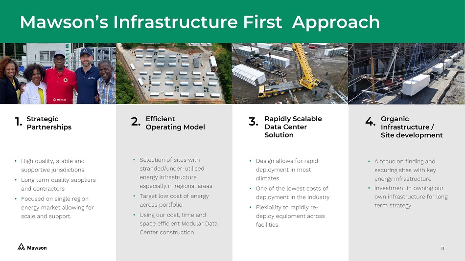 FY2022 Investor Presentation 10 Current Exahash Capacity 1 Current MW capacity 2 Future potential MW capacity 2 Future potential Exahash Capacity 1 Total EH 2 Modular Data Center Capacity Lease Term Energy Mix Sharon, PA USA 4.2 EH 1 120 MW - - 4.2 EH 1 60 14+ Years 100% carbon - free Midland, PA USA 4.2 EH 1 120 MW - - 4.2 EH 1 60 13+ Years 100% carbon - free Site 1 USA +150 MW +5.3 EH 1 5.3 EH 1 75 TBA Site 2 USA +24 MW +0.8 EH 1 0.8 EH 1 12 Freehold Site 3 USA +18 MW +0.6 EH 1 0.6 EH 1 9 TBA Total 8.4 EH 1 240 MW +192 MW 6.7 EH 1 15.1 EH 1 216 - - Industry Leading Bitcoin Mining Facilities 1. Exahash capacity assumes installation of current generation ASIC Bitcoin Mining hardware including but not limited to Bitmain S19J Pro, MicroBT M30/1, Avalon A1246 assuming approximately 30 megawatt per 1 Exahash. 2. Statements about ASIC miner capacity and Exahash forecasts in this document are not an assurance that Mawson will have that m any ASIC miners available to deploy (whether self - mining or hosted units). Mawson’s ability to deploy units will depend on many fac tors such as Mawson’s future ASIC miner purchases and sales, our ability to attract future hosting customers, and the number of ASIC miners customers have to deploy. TH0 TH1 TH2