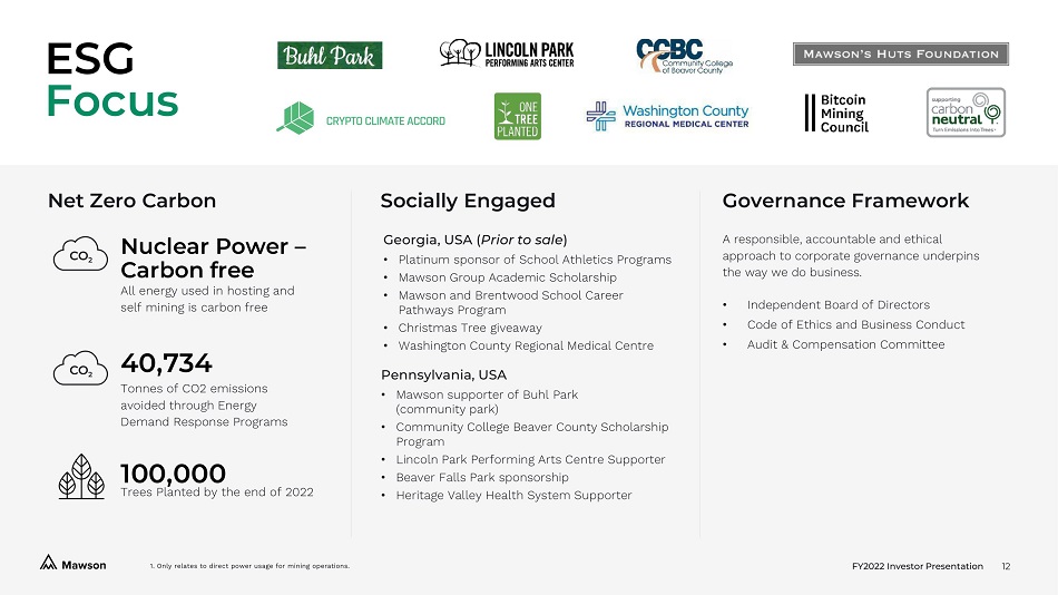 FY2022 Investor Presentation 11 11 Mawson’s Infrastructure First Approach • High quality, stable and supportive jurisdictions • Long term quality suppliers and contractors • Focused on single region energy market allowing for scale and support. • Selection of sites with stranded/under - utilised energy infrastructure especially in regional areas • Target low cost of energy across portfolio • Using our cost, time and space efficient Modular Data Center construction • Design allows for rapid deployment in most climates • One of the lowest costs of deployment in the industry • Flexibility to rapidly re - deploy equipment across facilities • A focus on finding and securing sites with key energy infrastructure • Investment in owning our own infrastructure for long term strategy Strategic Partnerships Efficient Operating Model Rapidly Scalable Data Center Solution Organic Infrastructure / Site development 1. 2 . 3. 4 . TH0
