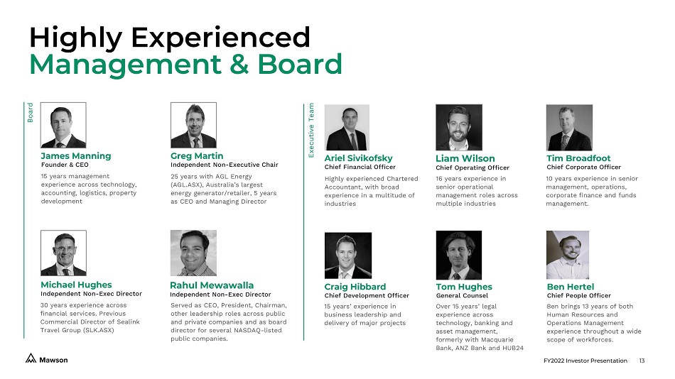 FY2022 Investor Presentation 12 ESG Focus 100,000 Nuclear Power – Carbon free Georgia, USA ( Prior to sale ) • Platinum sponsor of School Athletics Programs • Mawson Group Academic Scholarship • Mawson and Brentwood School Career Pathways Program • Christmas Tree giveaway • Washington County Regional Medical Centre Pennsylvania, USA • Mawson supporter of Buhl Park (community park) • Community College Beaver County Scholarship Program • Lincoln Park Performing Arts Centre Supporter • Beaver Falls Park sponsorship • Heritage Valley Health System Supporter A responsible, accountable and ethical approach to corporate governance underpins the way we do business. • Independent Board of Directors • Code of Ethics and Business Conduct • Audit & Compensation Committee Net Zero Carbon Socially Engaged Governance Framework Trees Planted by the end of 2022 40,734 Tonnes of CO2 emissions avoided through Energy Demand Response Programs All energy used in hosting and self mining is carbon free 1. Only relates to direct power usage for mining operations. LW0 TB1 TB2 TH3