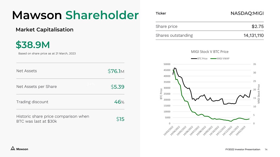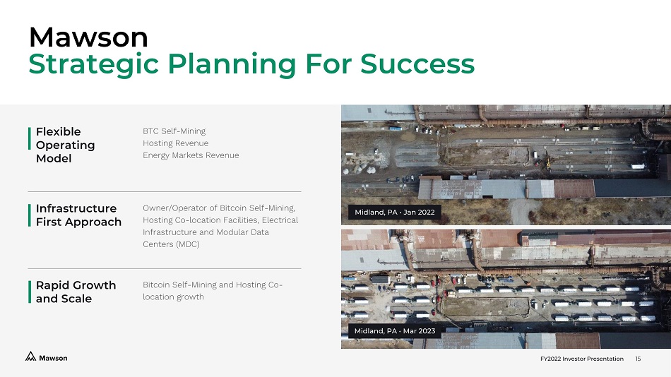 FY2022 Investor Presentation 14 Ticker NASDAQ:MIGI Share price $2.75 S hares outstanding 14,131,110 $38.9M Market Capitalisation Mawson Shareholder 24% Based on share price as at 21 March, 2023 Net Assets $ 76.1 M Net Assets per Share $ 5.39 Trading discount 46 % Historic share price comparison when BTC was last at $30k $ 15 0 5 10 15 20 25 30 35 0 5000 10000 15000 20000 25000 30000 35000 40000 45000 50000 MIGI Stock Price BTC Price MIGI Stock V BTC Price BTC Price MIGI VWAPTB0