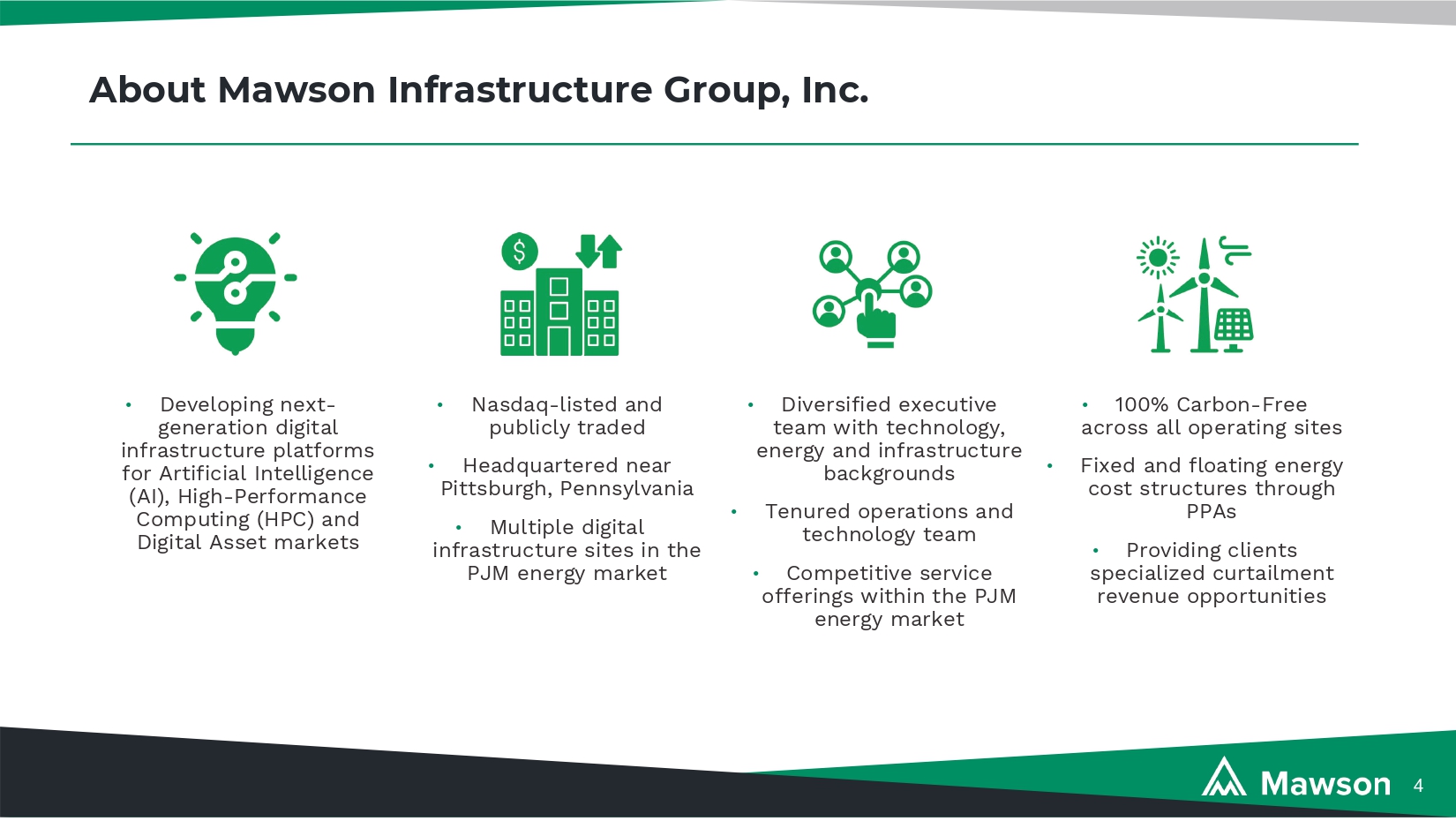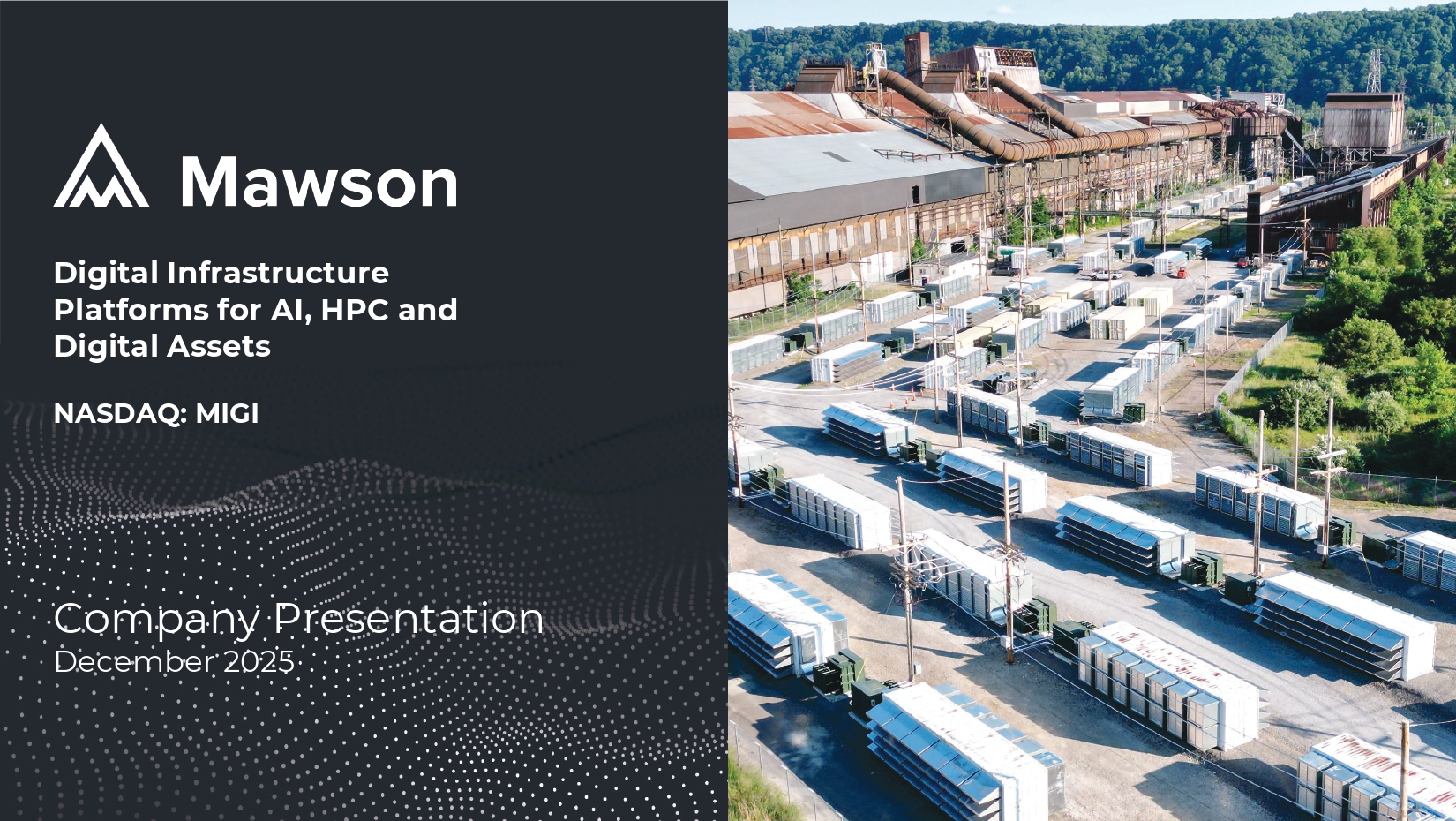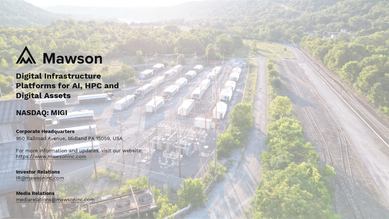 Digital Infrastructure Platforms for AI, HPC and Digital Assets Corporate Headquarters 950 Railroad Avenue, Midland PA 15059, USA Investor Relations IR@mawsoninc.com Media Relations mediarelations@mawsoninc.com NASDAQ: MIGI For more information and updates, visit our website: https://www.mawsoninc.com