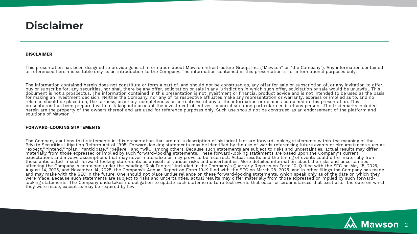 DISCLAIMER This presentation has been designed to provide general information about Mawson Infrastructure Group, Inc. (“Mawson” or "the Com pany”). Any information contained or referenced herein is suitable only as an introduction to the Company. The information contained in this presentation is fo r i nformational purposes only. The information contained herein does not constitute or form a part of, and should not be construed as, any offer for sale or su bscription of, or any invitation to offer, buy or subscribe for, any securities, nor shall there be any offer, solicitation or sale in any jurisdiction in which such of fer , solicitation or sale would be unlawful. This document is not a prospectus. The information contained in this presentation is not investment or financial product advice an d i s not intended to be used as the basis for making an investment decision. Neither the Company, nor any of its respective affiliates make any representation or warra nty , express or implied as to, and no reliance should be placed on, the fairness, accuracy, completeness or correctness of any of the information or opinions conta ine d in this presentation. This presentation has been prepared without taking into account the investment objectives, financial situation particular needs of an y person. The trademarks included herein are the property of the owners thereof and are used for reference purposes only. Such use should not be construed as a n e ndorsement of the platform and solutions of Mawson. FORWARD - LOOKING STATEMENTS The Company cautions that statements in this presentation that are not a description of historical fact are forward - looking stat ements within the meaning of the Private Securities Litigation Reform Act of 1995. Forward - looking statements may be identified by the use of words referencing f uture events or circumstances such as “expect,” “intend,” “plan,” “anticipate,” “believe,” and “will,” among others. Because such statements are subject to risks a nd uncertainties, actual results may differ materially from those expressed or implied by such forward - looking statements. These forward - looking statements are based upon t he Company’s current expectations and involve assumptions that may never materialize or may prove to be incorrect. Actual results and the timing o f e vents could differ materially from those anticipated in such forward - looking statements as a result of various risks and uncertainties. More detailed information about the risks and uncertainties affecting the Company is contained under the heading “Risk Factors” included in the Company’s Quarterly Reports on Form 10 - Q fil ed with the SEC on May 15, 2025, August 14, 2025, and November 14, 2025, the Company’s Annual Report on Form 10 - K filed with the SEC on March 28, 2025, and in ot her filings the Company has made and may make with the SEC in the future . One should not place undue reliance on these forward - looking statements, which speak only as of the date on which they were made. Because such statements are subject to risks and uncertainties, actual results may differ materially from those ex pre ssed or implied by such forward - looking statements. The Company undertakes no obligation to update such statements to reflect events that occur or circumstan ces that exist after the date on which they were made, except as may be required by law. Disclaimer 2