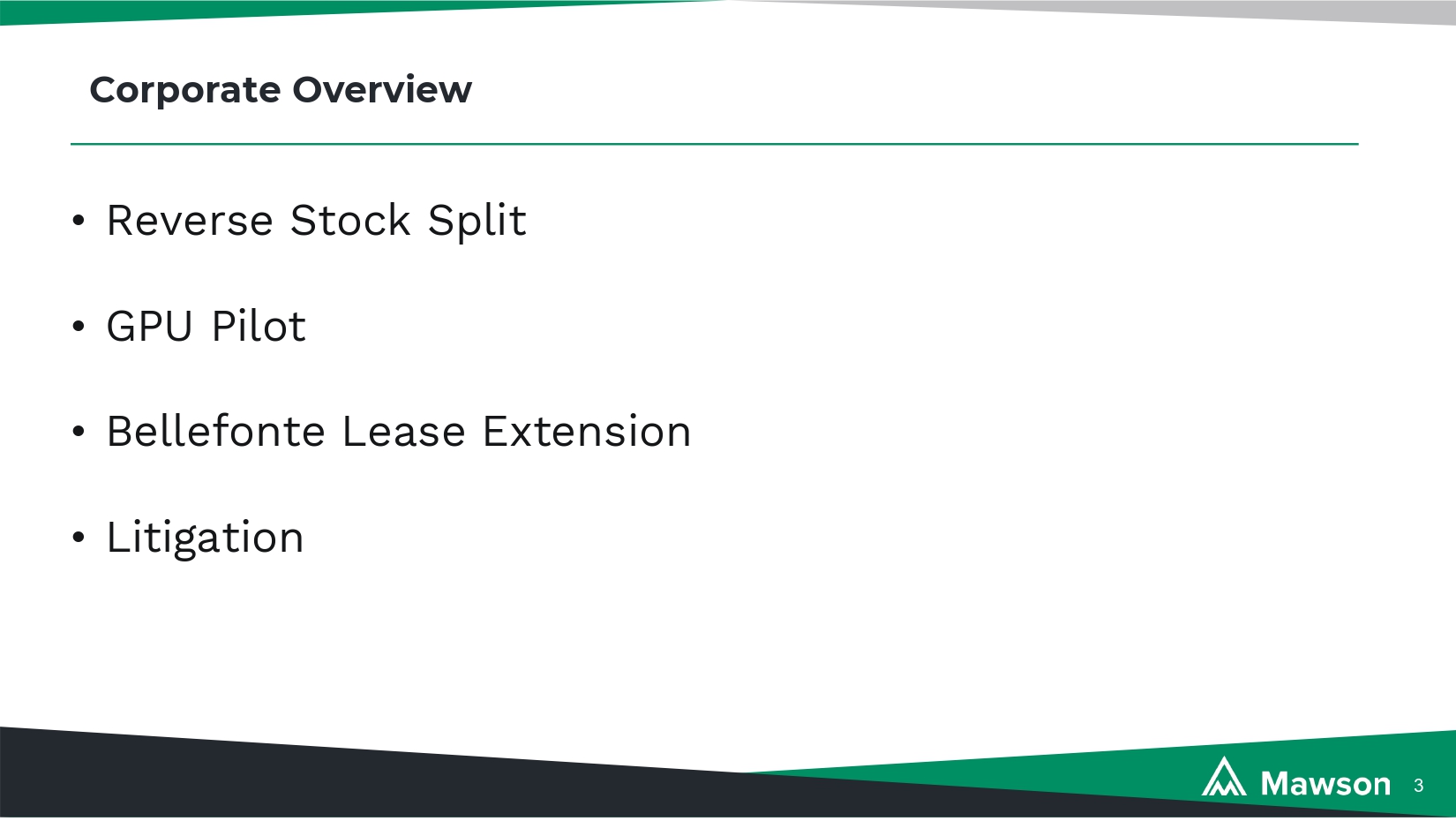 • Reverse Stock Split • GPU Pilot • Bellefonte Lease Extension • Litigation Corporate Overview 3