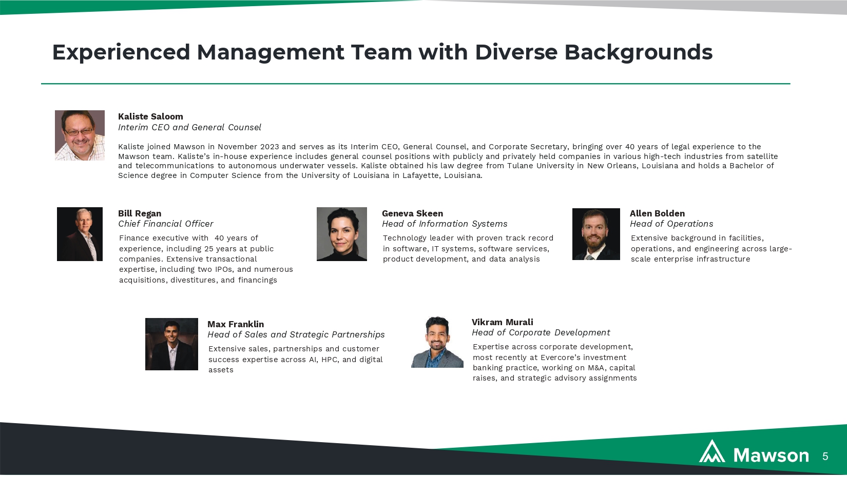 Experienced Management Team with Diverse Backgrounds Kaliste Saloom Interim CEO and General Counsel Kaliste joined Mawson in November 2023 and serves as its Interim CEO, General Counsel, and Corporate Secretary, bringing over 40 years of legal experience to the Mawson team. Kaliste’s in - house experience includes general counsel positions with publicly and privately held companies in various high - tech industri es from satellite and telecommunications to autonomous underwater vessels. Kaliste obtained his law degree from Tulane University in New Orlean s, Louisiana and holds a Bachelor of Science degree in Computer Science from the University of Louisiana in Lafayette, Louisiana. Geneva Skeen Head of Information Systems Technology leader with proven track record in software, IT systems, software services, product development, and data analysis Allen Bolden Head of Operations Extensive background in facilities, operations, and engineering across large - scale enterprise infrastructure Max Franklin Head of Sales and Strategic Partnerships Extensive sales, partnerships and customer success expertise across AI, HPC, and digital assets Vikram Murali Head of Corporate Development Expertise across corporate development, most recently at Evercore’s investment banking practice, working on M&A, capital raises, and strategic advisory assignments Bill Regan Chief Financial Officer Finance executive with 40 years of experience, including 25 years at public companies. Extensive transactional expertise, including two IPOs, and numerous acquisitions, divestitures, and financings 5
