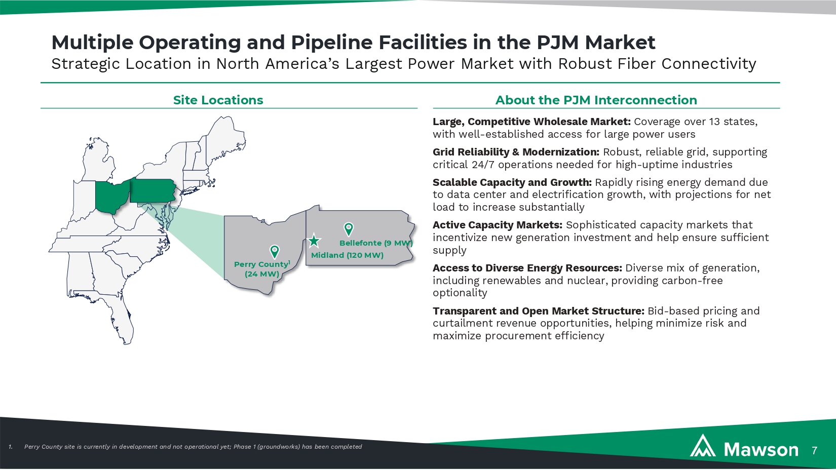 • Diversified, asset - light, recurring revenue stream • Adaptable contracts with capacity flexibility and rapid deployments • Add - ons such as Managed Site Services and Software Services Diversified Mix of Business Segments Creating Natural Synergies for the Company • Participation in innovative energy management programs • Provides stability to electric grid and generates revenue • Optimizes energy costs while contributing to overall grid reliability Digital Assets Mining Platform • High - growth and high - value foundational revenue opportunities • Builds upon core capabilities, expands operational capabilities and service offerings as an AI cloud or infrastructure provider AI/HPC Platform Energy Management Platform • Provides upside potential during favorable market conditions • Enhances operator expertise, benefiting all colocation clients • Allows strategic resource allocation based on market dynamics Digital Colocation Platform 6