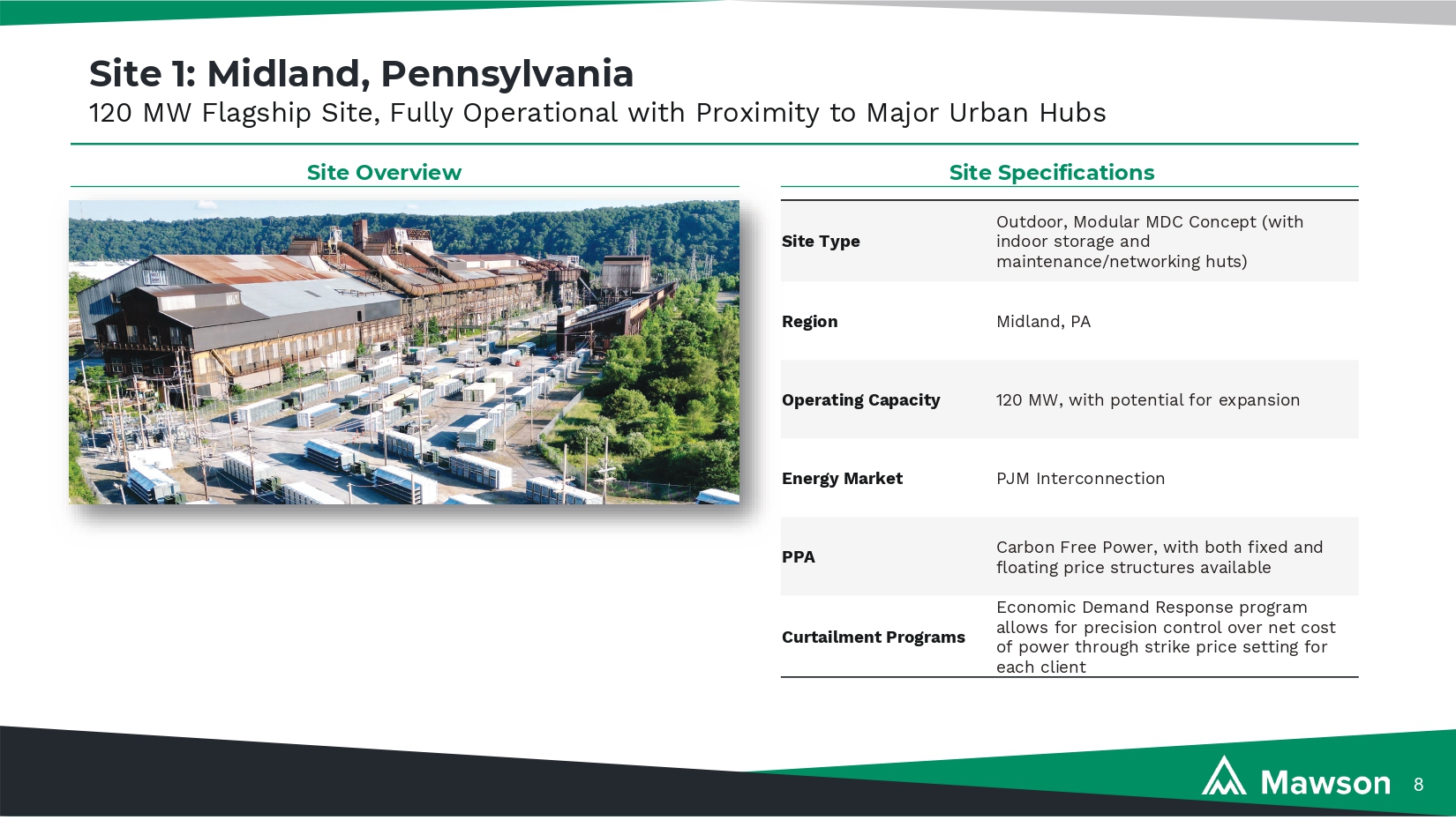 7 Site Locations About the PJM Interconnection Multiple Operating and Pipeline Facilities in the PJM Market Strategic Location in North America’s Largest Power Market with Robust Fiber Connectivity Large, Competitive Wholesale Market: Coverage over 13 states, with well - established access for large power users Grid Reliability & Modernization: Robust, reliable grid, supporting critical 24/7 operations needed for high - uptime industries Scalable Capacity and Growth: Rapidly rising energy demand due to data center and electrification growth, with projections for net load to increase substantially Active Capacity Markets: Sophisticated capacity markets that incentivize new generation investment and help ensure sufficient supply Access to Diverse Energy Resources: Diverse mix of generation, including renewables and nuclear, providing carbon - free optionality Transparent and Open Market Structure: Bid - based pricing and curtailment revenue opportunities, helping minimize risk and maximize procurement efficiency 1. Perry County site is currently in development and not operational yet; Phase 1 (groundworks) has been completed Bellefonte (9 MW) Perry County 1 (24 MW) Midland (120 MW)