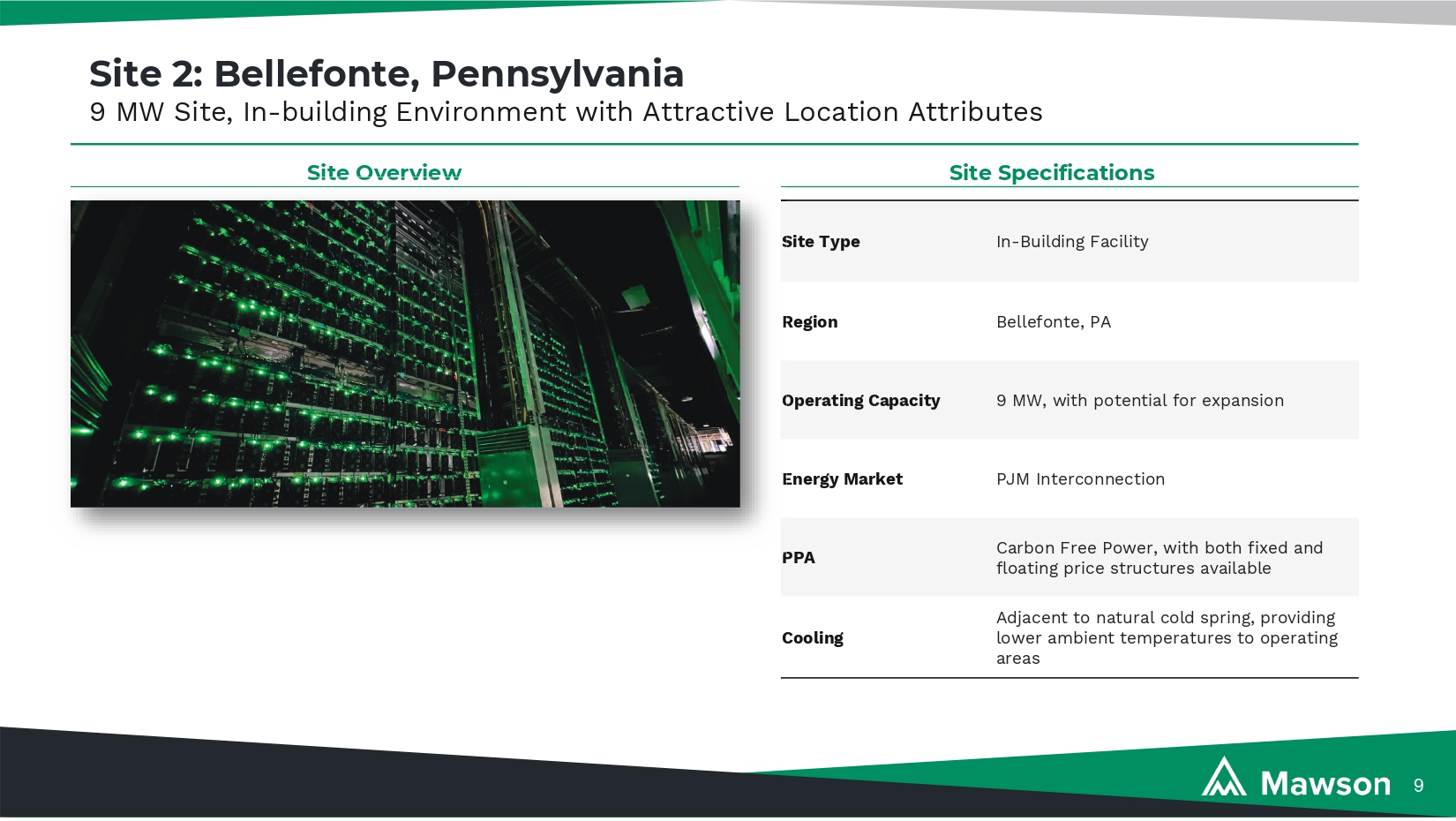Site 2: Bellefonte, Pennsylvania 9 MW Site, In - building Environment with Attractive Location Attributes In - Building Facility Site Type Bellefonte, PA Region 9 MW, with potential for expansion Operating Capacity PJM Interconnection Energy Market Carbon Free Power, with both fixed and floating price structures available PPA Adjacent to natural cold spring, providing lower ambient temperatures to operating areas Cooling Site Specifications Site Overview 9