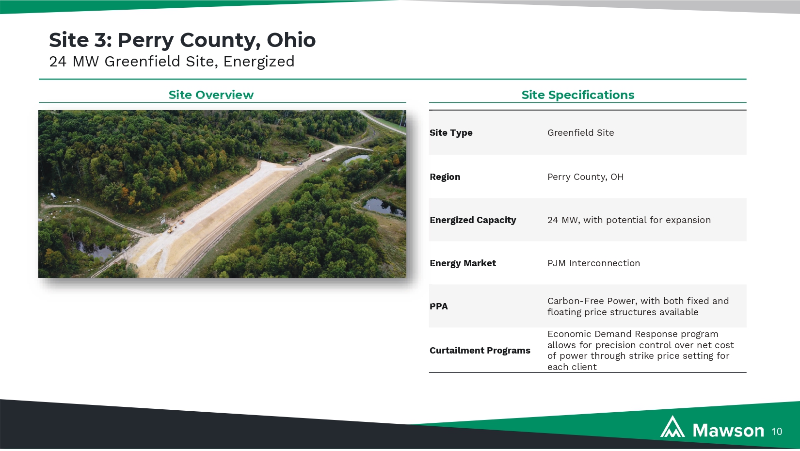 Site 3: Perry County, Ohio 24 MW Greenfield Site, Energized Greenfield Site Site Type Perry County, OH Region 24 MW, with potential for expansion Energized Capacity PJM Interconnection Energy Market Carbon - Free Power, with both fixed and floating price structures available PPA Economic Demand Response program allows for precision control over net cost of power through strike price setting for each client Curtailment Programs Site Specifications Site Overview 10