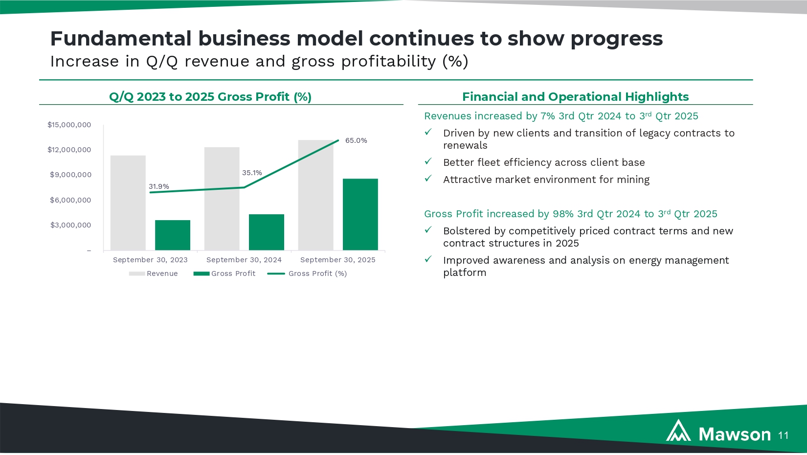 Financial and Operational Highlights Fundamental business model continues to show progress Increase in Q/Q revenue and gross profitability (%) Revenues increased by 7% 3rd Qtr 2024 to 3 rd Qtr 2025 x Driven by new clients and transition of legacy contracts to renewals x Better fleet efficiency across client base x Attractive market environment for mining Gross Profit increased by 98% 3rd Qtr 2024 to 3 rd Qtr 2025 x Bolstered by competitively priced contract terms and new contract structures in 2025 x Improved awareness and analysis on energy management platform Q/Q 2023 to 2025 Gross Profit (%) 11 31.9% 35.1% 65.0% – $3,000,000 $6,000,000 $9,000,000 $12,000,000 $15,000,000 September 30, 2023 September 30, 2024 September 30, 2025 Revenue Gross Profit Gross Profit (%)