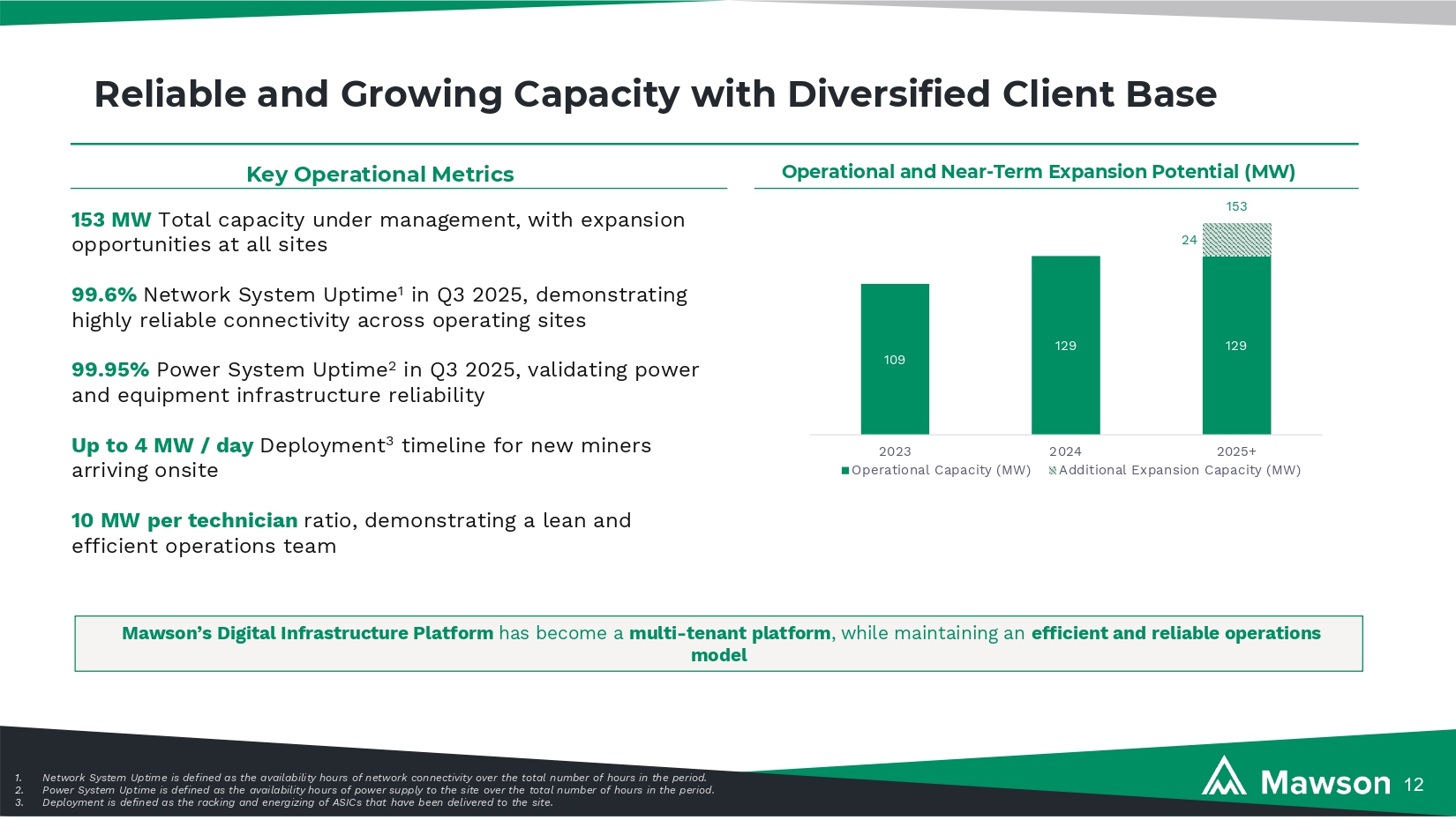 Reliable and Growing Capacity with Diversified Client Base 153 MW Total capacity under management, with expansion opportunities at all sites 99.6% Network System Uptime 1 in Q3 2025, demonstrating highly reliable connectivity across operating sites 99.95% Power System Uptime 2 in Q3 2025, validating power and equipment infrastructure reliability Up to 4 MW / day Deployment 3 timeline for new miners arriving onsite 10 MW per technician ratio, demonstrating a lean and efficient operations team Key Operational Metrics Operational and Near - Term Expansion Potential (MW) 109 129 129 24 2023 2024 2025+ Operational Capacity (MW) Additional Expansion Capacity (MW) 153 Mawson’s Digital Infrastructure Platform has become a multi - tenant platform , while maintaining an efficient and reliable operations model 12 1. Network System Uptime is defined as the availability hours of network connectivity over the total number of hours in the peri od. 2. Power System Uptime is defined as the availability hours of power supply to the site over the total number of hours in the pe rio d. 3. Deployment is defined as the racking and energizing of ASICs that have been delivered to the site.