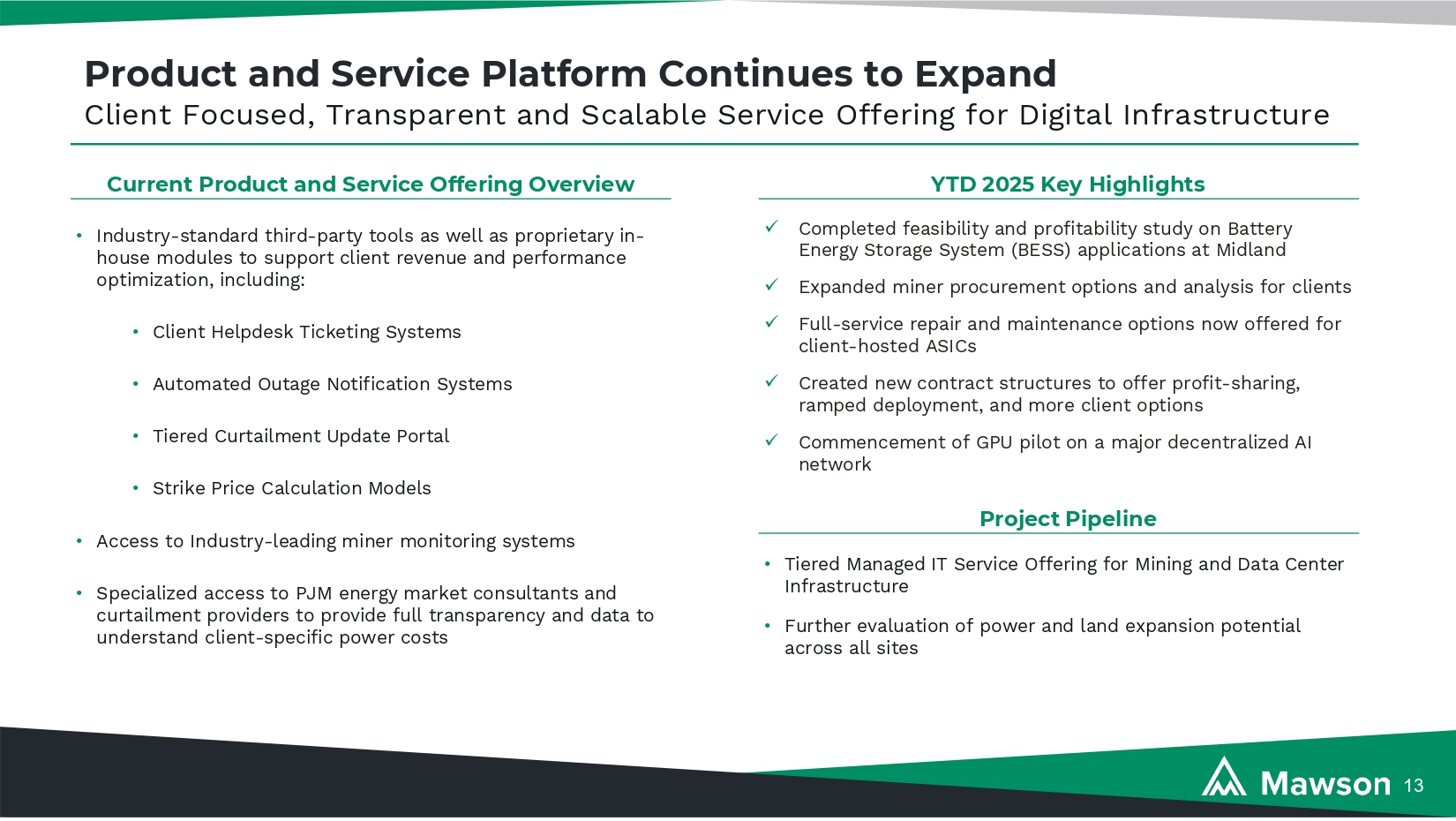 Product and Service Platform Continues to Expand Client Focused, Transparent and Scalable Service Offering for Digital Infrastructure Current Product and Service Offering Overview • Industry - standard third - party tools as well as proprietary in - house modules to support client revenue and performance optimization, including: • Client Helpdesk Ticketing Systems • Automated Outage Notification Systems • Tiered Curtailment Update Portal • Strike Price Calculation Models • Access to Industry - leading miner monitoring systems • Specialized access to PJM energy market consultants and curtailment providers to provide full transparency and data to understand client - specific power costs x Completed feasibility and profitability study on Battery Energy Storage System (BESS) applications at Midland x Expanded miner procurement options and analysis for clients x Full - service repair and maintenance options now offered for client - hosted ASICs x Created new contract structures to offer profit - sharing, ramped deployment, and more client options x Commencement of GPU pilot on a major decentralized AI network YTD 2025 Key Highlights • Tiered Managed IT Service Offering for Mining and Data Center Infrastructure • Further evaluation of power and land expansion potential across all sites Project Pipeline 13