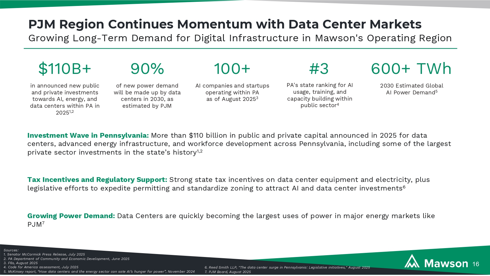 PJM Region Continues Momentum with Data Center Markets Growing Long - Term Demand for Digital Infrastructure in Mawson's Operating Region $110B+ in announced new public and private investments towards AI, energy, and data centers within PA in 2025 1,2 90% of new power demand will be made up by data centers in 2030, as estimated by PJM 100+ AI companies and startups operating within PA as of August 2025 3 Investment Wave in Pennsylvania: More than $110 billion in public and private capital announced in 2025 for data centers, advanced energy infrastructure, and workforce development across Pennsylvania, including some of the largest private sector investments in the state’s history 1,2 Tax Incentives and Regulatory Support: Strong state tax incentives on data center equipment and electricity, plus legislative efforts to expedite permitting and standardize zoning to attract AI and data center investments 6 Growing Power Demand: Data Centers are quickly becoming the largest uses of power in major energy markets like PJM 7 16 Sources: 1. Senator McCormick Press Release, July 2025 2. PA Department of Community and Economic Development, June 2025 3. F6s , August 2025 4. Code for America assessment, July 2025 5. McKinsey report, “How data centers and the energy sector can sate AI’s hunger for power”, November 2024 #3 PA's state ranking for AI usage, training, and capacity building within public sector 4 600+ TWh 2030 Estimated Global AI Power Demand 5 6. Reed Smith LLP, "The data center surge in Pennsylvania: Legislative initiatives," August 2025 7. PJM Board, August 2025