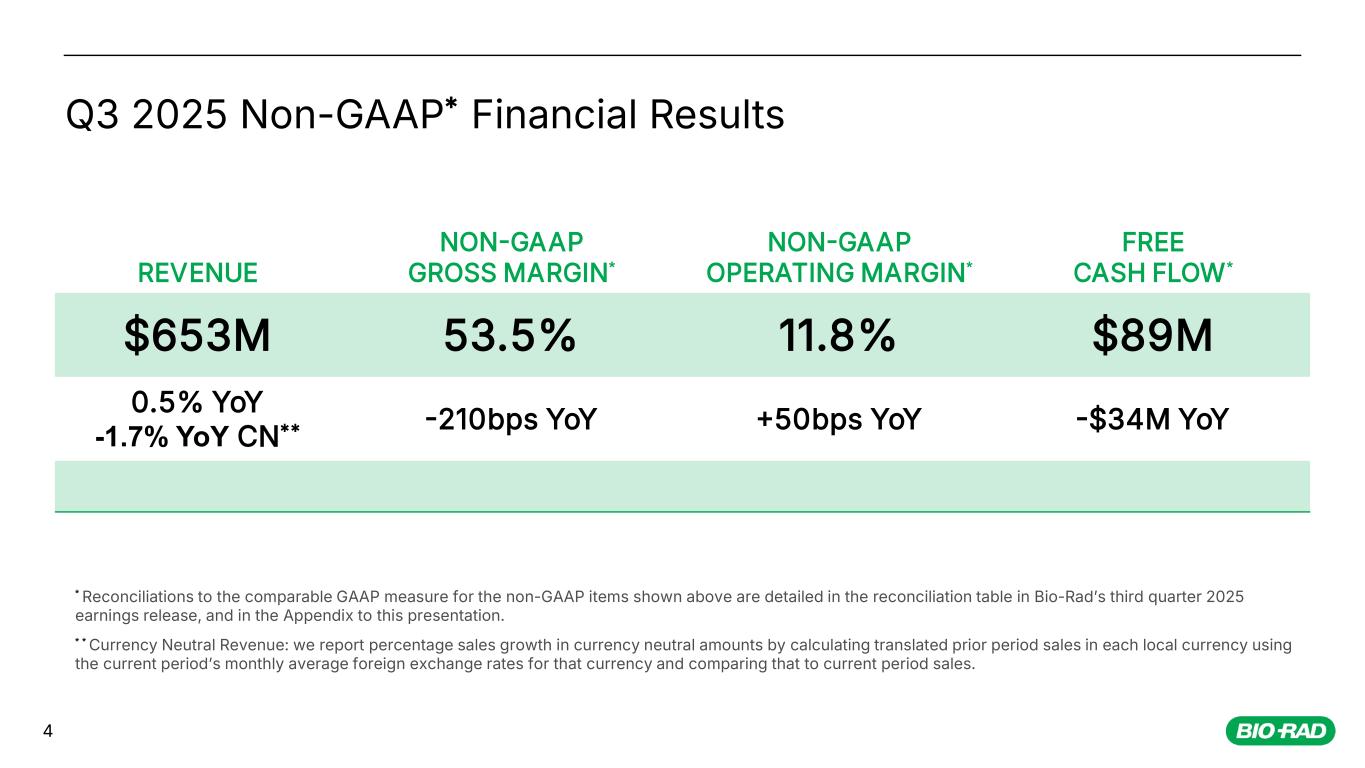 REVENUE GROSS MARGIN OPERATING MARGIN NET CASH FROM OPERATIONS $653M 52.6% 10.0% $121M 0.5% YoY -1.7% YoY CN* 220bps YoY 10bps YoY $43M YoY 3 Q3 2025 GAAP Financial Results * Currency Neutral Revenue: we report percentage sales growth in currency neutral amounts by calculating translated prior period sales in each local currency using the current period s̓ monthly average foreign exchange rates for that currency and comparing that to current period sales.