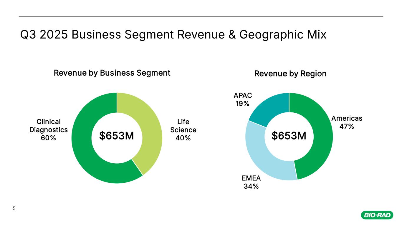 REVENUE NONGAAP GROSS MARGIN* NONGAAP OPERATING MARGIN* FREE CASH FLOW* $653M 53.5% 11.8% $89M 0.5% YoY -1.7% YoY CN** 210bps YoY 50bps YoY $34M YoY 4 Q3 2025 Non-GAAP* Financial Results * Reconciliations to the comparable GAAP measure for the non-GAAP items shown above are detailed in the reconciliation table in Bio-Radʼs third quarter 2025 earnings release, and in the Appendix to this presentation. * * Currency Neutral Revenue: we report percentage sales growth in currency neutral amounts by calculating translated prior period sales in each local currency using the current periodʼs monthly average foreign exchange rates for that currency and comparing that to current period sales.