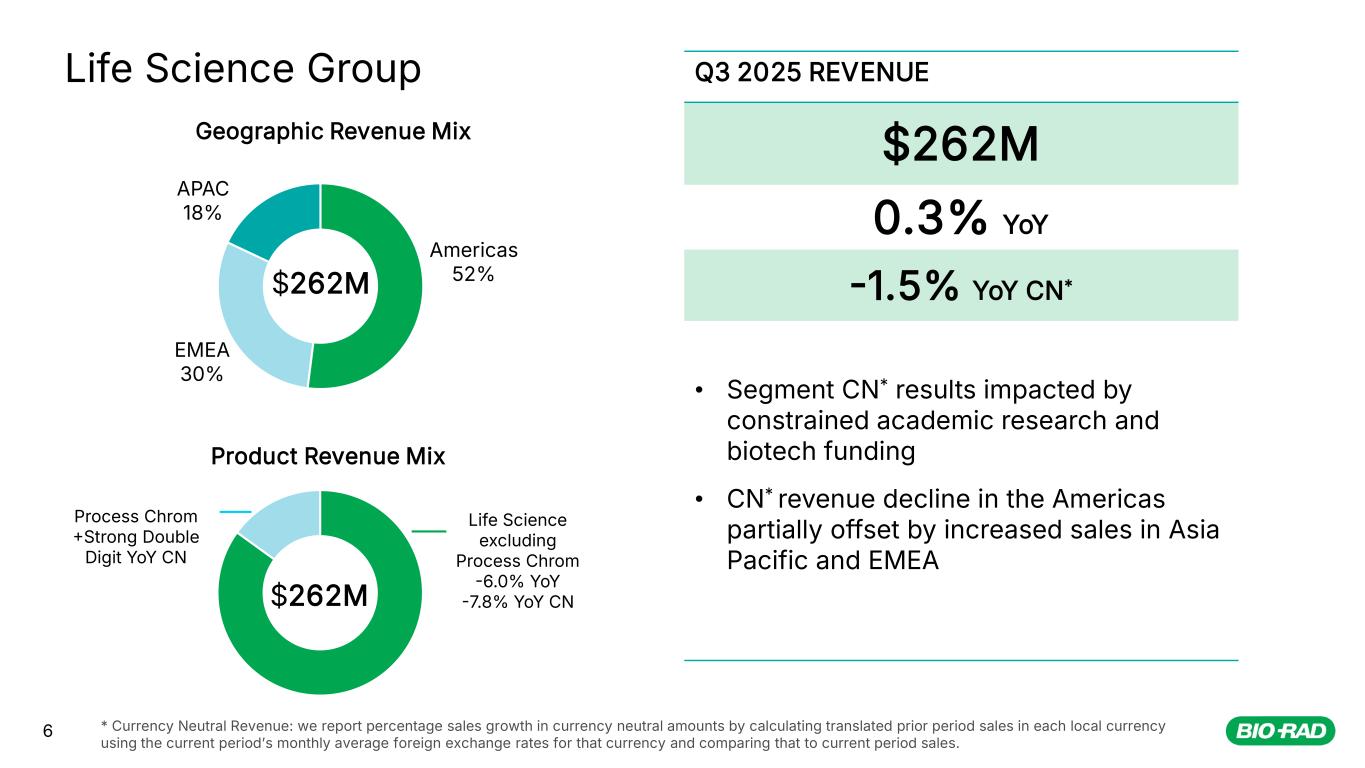 5 Life Science 40% Clinical Diagnostics 60% Revenue by Business Segment Q3 2025 Business Segment Revenue & Geographic Mix Americas 47% EMEA 34% APAC 19% Revenue by Region $653M $653M