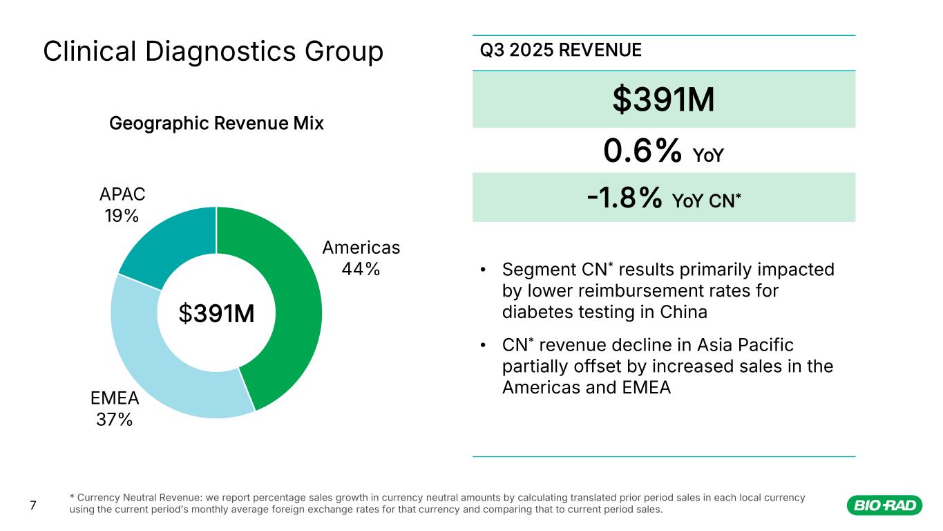 6 Q3 2025 REVENUE $262M 0.3% YoY 1.5% YoY CN* • Segment CN* results impacted by constrained academic research and biotech funding • CN* revenue decline in the Americas partially offset by increased sales in Asia Pacific and EMEA Life Science Group Americas 52% EMEA 30% APAC 18% Geographic Revenue Mix $262M $262M Life Science excluding Process Chrom 6.0% YoY 7.8% YoY CN Process Chrom Strong Double Digit YoY CN * Currency Neutral Revenue: we report percentage sales growth in currency neutral amounts by calculating translated prior period sales in each local currency using the current periodʼs monthly average foreign exchange rates for that currency and comparing that to current period sales. Product Revenue Mix