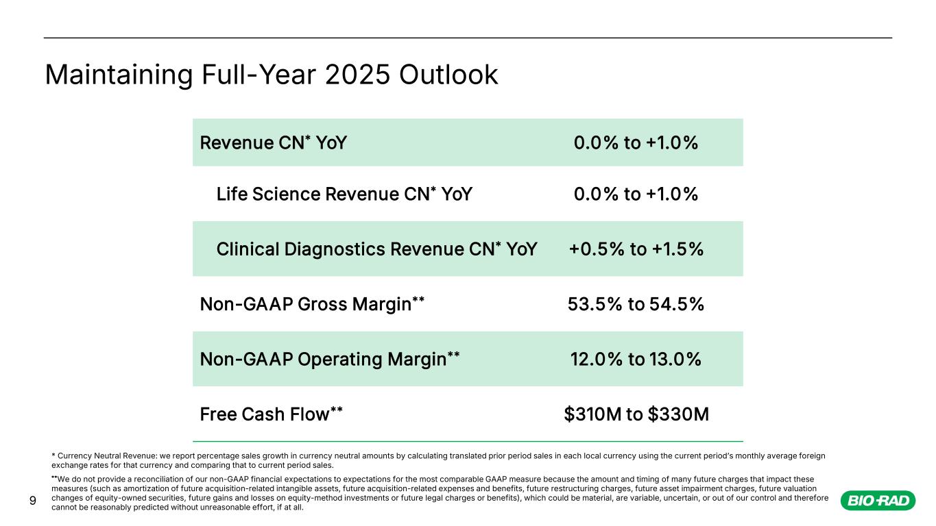 8 Balance Sheet Highlights In $ millions) September 30, 2025 December 31, 2024 Cash & Short-Term Investments $1,419* $1,665 Long-Term Debt $1,201 $1,200 Inventories, net $783 $760 Investment in Sartorius AG $4,643 $4,469 * Cash balance change due to share repurchases, and the completion of Stilla Technologies acquisition on June 30, 2025