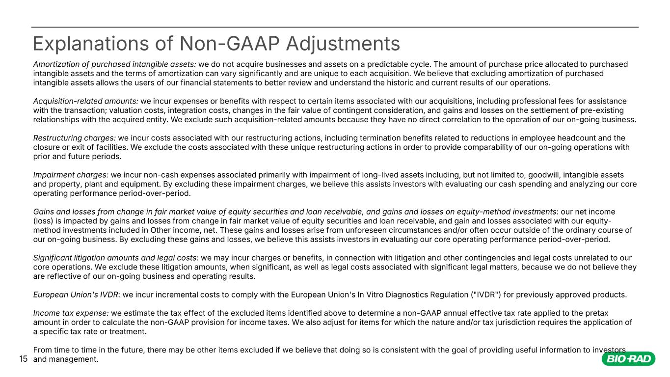 15 Explanations of Non-GAAP Adjustments Amortization of purchased intangible assets: we do not acquire businesses and assets on a predictable cycle. The amount of purchase price allocated to purchased intangible assets and the terms of amortization can vary significantly and are unique to each acquisition. We believe that excluding amortization of purchased intangible assets allows the users of our financial statements to better review and understand the historic and current results of our operations. Acquisition-related amounts: we incur expenses or benefits with respect to certain items associated with our acquisitions, including professional fees for assistance with the transaction; valuation costs, integration costs, changes in the fair value of contingent consideration, and gains and losses on the settlement of pre-existing relationships with the acquired entity. We exclude such acquisition-related amounts because they have no direct correlation to the operation of our on-going business. Restructuring charges: we incur costs associated with our restructuring actions, including termination benefits related to reductions in employee headcount and the closure or exit of facilities. We exclude the costs associated with these unique restructuring actions in order to provide comparability of our on-going operations with prior and future periods. Impairment charges: we incur non-cash expenses associated primarily with impairment of long-lived assets including, but not limited to, goodwill, intangible assets and property, plant and equipment. By excluding these impairment charges, we believe this assists investors with evaluating our cash spending and analyzing our core operating performance period-over-period. Gains and losses from change in fair market value of equity securities and loan receivable, and gains and losses on equity-method investments: our net income (loss) is impacted by gains and losses from change in fair market value of equity securities and loan receivable, and gain and losses associated with our equity- method investments included in Other income, net. These gains and losses arise from unforeseen circumstances and/or often occur outside of the ordinary course of our on-going business. By excluding these gains and losses, we believe this assists investors in evaluating our core operating performance period-over-period. Significant litigation amounts and legal costs: we may incur charges or benefits, in connection with litigation and other contingencies and legal costs unrelated to our core operations. We exclude these litigation amounts, when significant, as well as legal costs associated with significant legal matters, because we do not believe they are reflective of our on-going business and operating results. European Union's IVDR: we incur incremental costs to comply with the European Union's In Vitro Diagnostics Regulation ("IVDR") for previously approved products. Income tax expense: we estimate the tax effect of the excluded items identified above to determine a non-GAAP annual effective tax rate applied to the pretax amount in order to calculate the non-GAAP provision for income taxes. We also adjust for items for which the nature and/or tax jurisdiction requires the application of a specific tax rate or treatment. From time to time in the future, there may be other items excluded if we believe that doing so is consistent with the goal of providing useful information to investors and management.