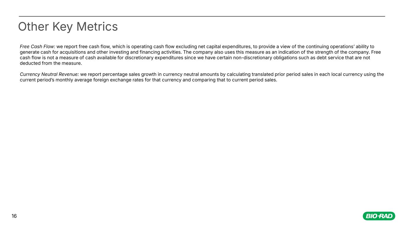 16 Other Key Metrics Free Cash Flow: we report free cash flow, which is operating cash flow excluding net capital expenditures, to provide a view of the continuing operationsʼ ability to generate cash for acquisitions and other investing and financing activities. The company also uses this measure as an indication of the strength of the company. Free cash flow is not a measure of cash available for discretionary expenditures since we have certain non-discretionary obligations such as debt service that are not deducted from the measure. Currency Neutral Revenue: we report percentage sales growth in currency neutral amounts by calculating translated prior period sales in each local currency using the current periodʼs monthly average foreign exchange rates for that currency and comparing that to current period sales.