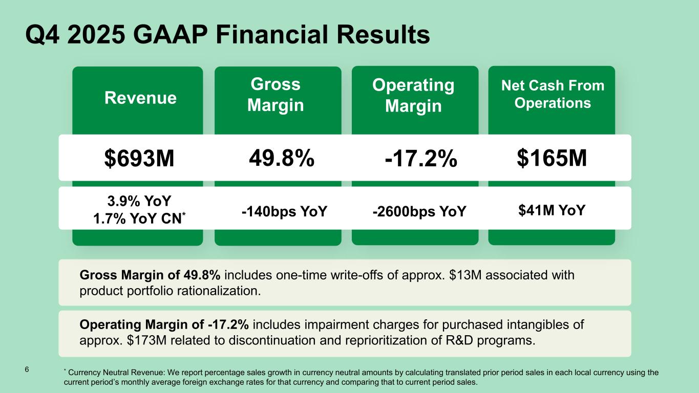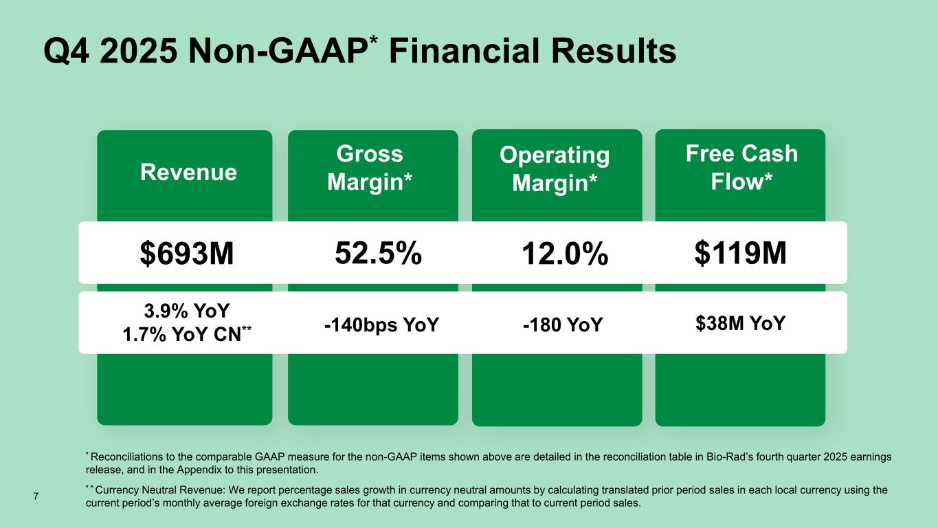 Q4 2025 GAAP Financial Results Revenue Gross Margin Operating Margin Net Cash From Operations $693M 3.9% YoY 1.7% YoY CN* 49.8% -140bps YoY -17.2% -2600bps YoY $165M $41M YoY * Currency Neutral Revenue: We report percentage sales growth in currency neutral amounts by calculating translated prior period sales in each local currency using the current period’s monthly average foreign exchange rates for that currency and comparing that to current period sales. 6 Gross Margin of 49.8% includes one-time write-offs of approx. $13M associated with product portfolio rationalization. Operating Margin of -17.2% includes impairment charges for purchased intangibles of approx. $173M related to discontinuation and reprioritization of R&D programs.