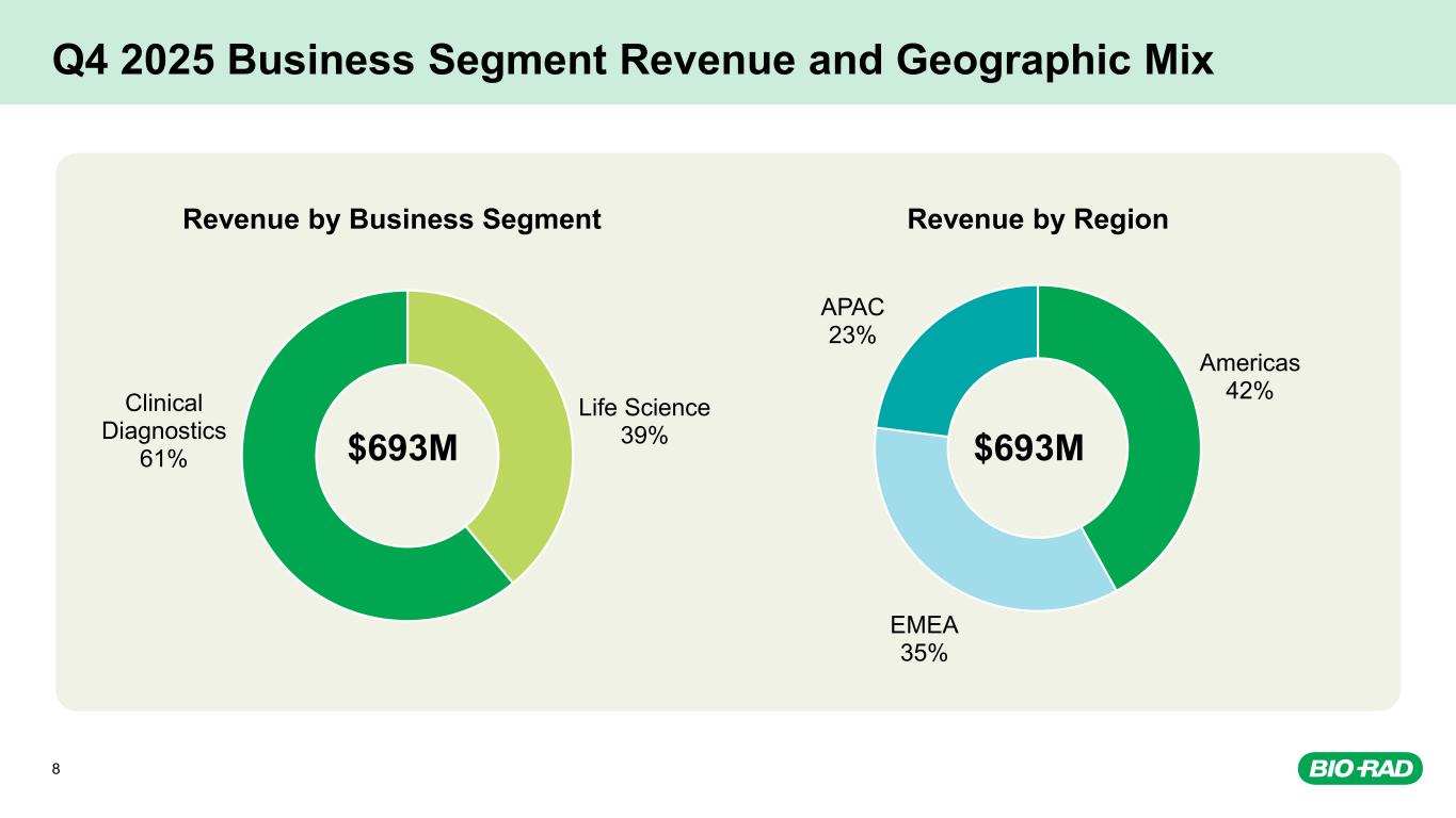 Q4 2025 Non-GAAP* Financial Results Revenue Gross Margin* Operating Margin* Free Cash Flow* $693M 3.9% YoY 1.7% YoY CN** 52.5% -140bps YoY 12.0% -180 YoY $119M $38M YoY * Reconciliations to the comparable GAAP measure for the non-GAAP items shown above are detailed in the reconciliation table in Bio-Rad’s fourth quarter 2025 earnings release, and in the Appendix to this presentation. * * Currency Neutral Revenue: We report percentage sales growth in currency neutral amounts by calculating translated prior period sales in each local currency using the current period’s monthly average foreign exchange rates for that currency and comparing that to current period sales.7