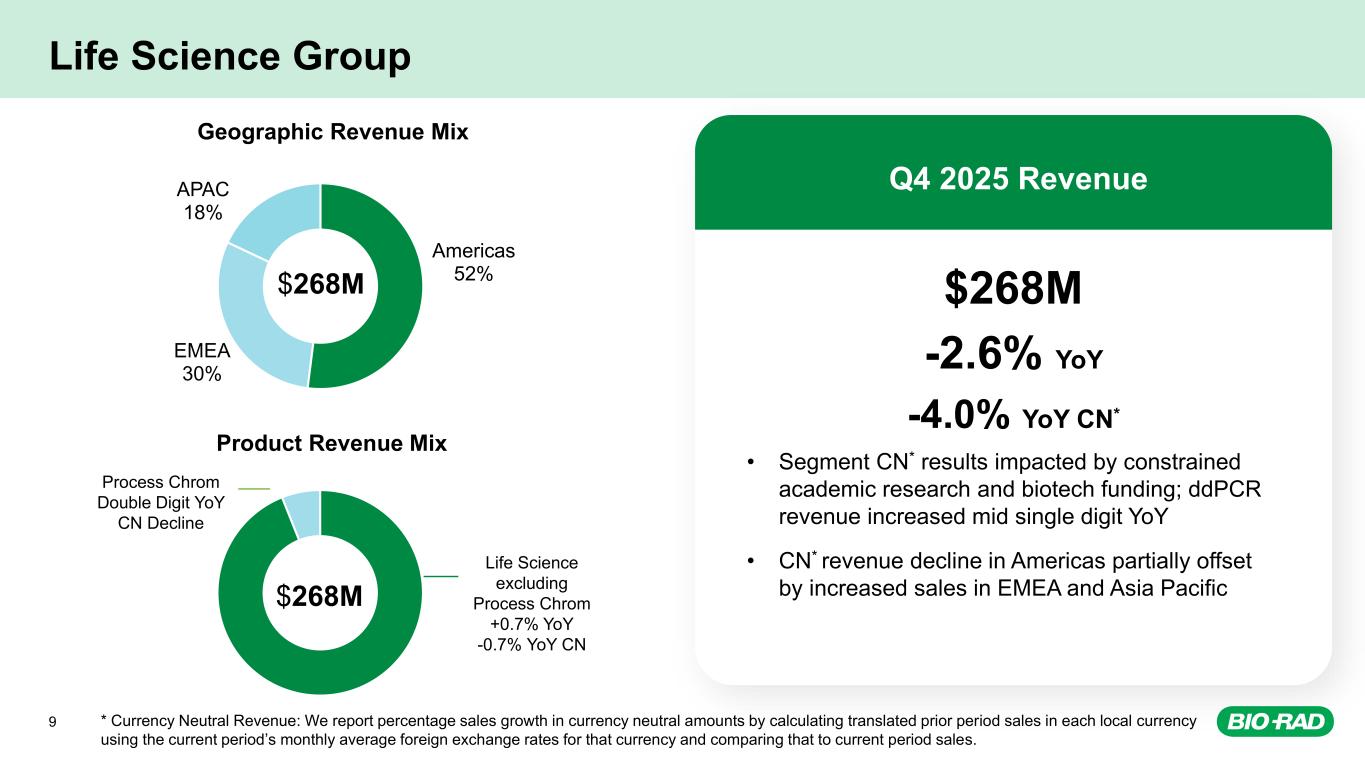 8 Q4 2025 Business Segment Revenue and Geographic Mix Life Science 39% Clinical Diagnostics 61% Revenue by Business Segment Americas 42% EMEA 35% APAC 23% Revenue by Region $693M $693M
