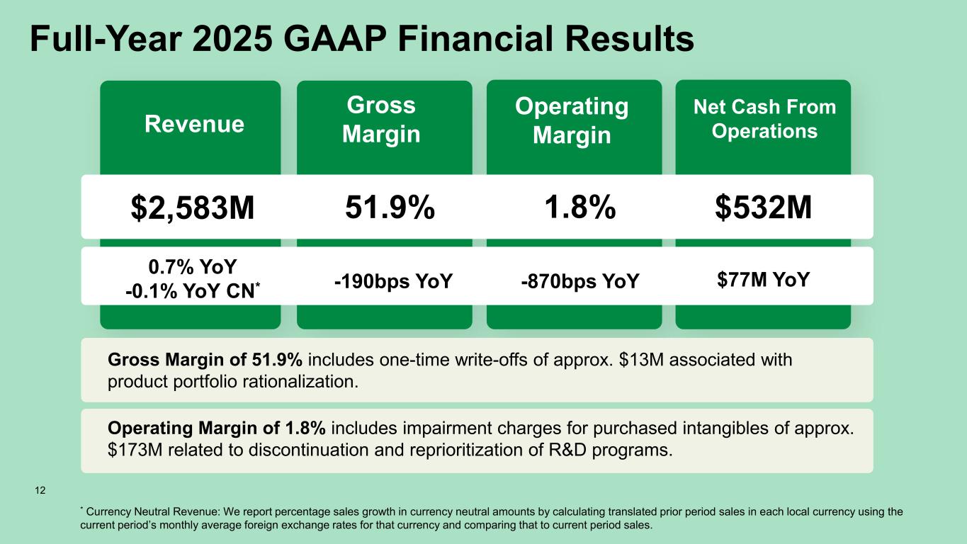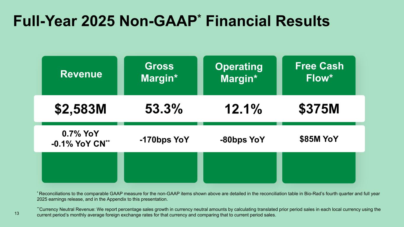 Full-Year 2025 GAAP Financial Results Revenue Gross Margin Operating Margin Net Cash From Operations $2,583M 0.7% YoY -0.1% YoY CN* 51.9% -190bps YoY 1.8% -870bps YoY $532M $77M YoY * Currency Neutral Revenue: We report percentage sales growth in currency neutral amounts by calculating translated prior period sales in each local currency using the current period’s monthly average foreign exchange rates for that currency and comparing that to current period sales. 12 Gross Margin of 51.9% includes one-time write-offs of approx. $13M associated with product portfolio rationalization. Operating Margin of 1.8% includes impairment charges for purchased intangibles of approx. $173M related to discontinuation and reprioritization of R&D programs.
