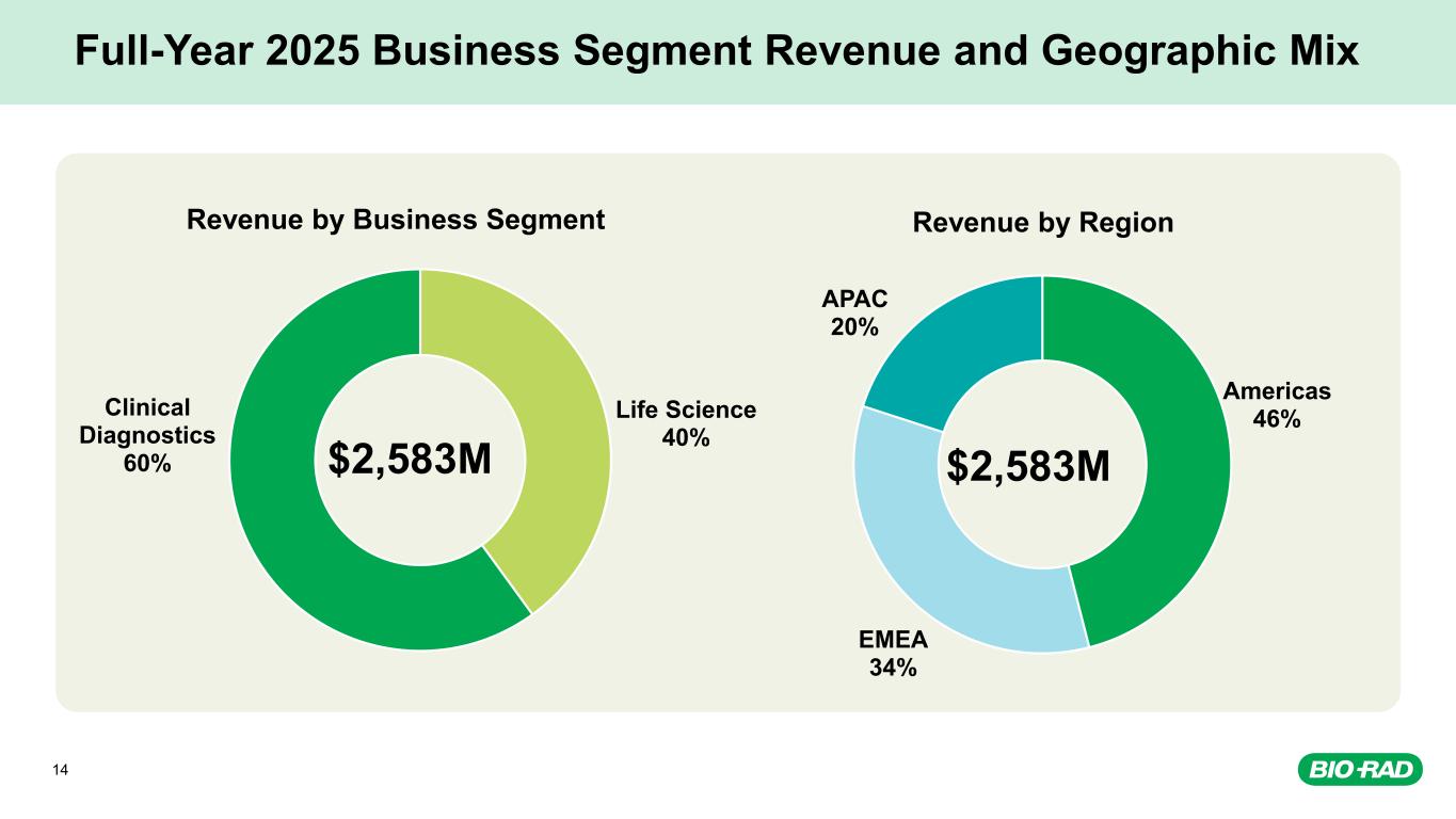 Full-Year 2025 Non-GAAP* Financial Results Revenue Gross Margin* Operating Margin* Free Cash Flow* $2,583M 0.7% YoY -0.1% YoY CN** 53.3% -170bps YoY 12.1% -80bps YoY $375M $85M YoY **Currency Neutral Revenue: We report percentage sales growth in currency neutral amounts by calculating translated prior period sales in each local currency using the current period’s monthly average foreign exchange rates for that currency and comparing that to current period sales. * Reconciliations to the comparable GAAP measure for the non-GAAP items shown above are detailed in the reconciliation table in Bio-Rad’s fourth quarter and full year 2025 earnings release, and in the Appendix to this presentation. 13