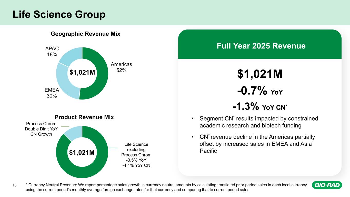Full-Year 2025 Business Segment Revenue and Geographic Mix Life Science 40% Clinical Diagnostics 60% Revenue by Business Segment Americas 46% EMEA 34% APAC 20% Revenue by Region $2,583M $2,583M 14