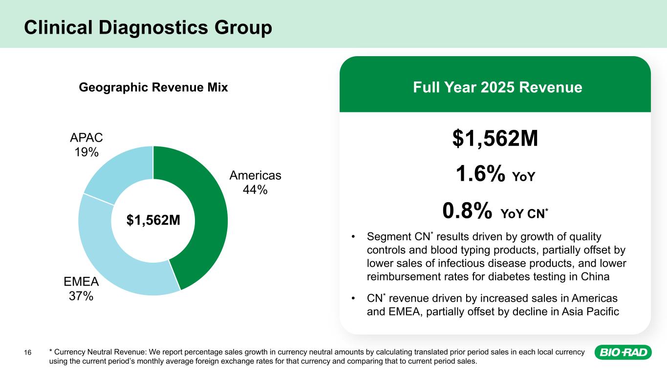 Life Science Group Full Year 2025 Revenue $1,021M -0.7% YoY -1.3% YoY CN* • Segment CN* results impacted by constrained academic research and biotech funding • CN* revenue decline in the Americas partially offset by increased sales in EMEA and Asia Pacific Americas 52% EMEA 30% APAC 18% Geographic Revenue Mix $1,021M $1,021M Life Science excluding Process Chrom -3.5% YoY -4.1% YoY CN Process Chrom Double Digit YoY CN Growth Product Revenue Mix 15 * Currency Neutral Revenue: We report percentage sales growth in currency neutral amounts by calculating translated prior period sales in each local currency using the current period’s monthly average foreign exchange rates for that currency and comparing that to current period sales.