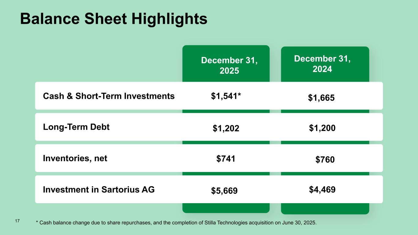 Balance Sheet Highlights December 31, 2025 December 31, 2024 Cash & Short-Term Investments Long-Term Debt Inventories, net Investment in Sartorius AG $1,541* $1,202 $741 $5,669 $1,665 $1,200 $760 $4,469 * Cash balance change due to share repurchases, and the completion of Stilla Technologies acquisition on June 30, 2025.17