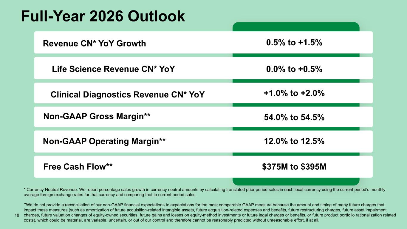 Full-Year 2026 Outlook Non-GAAP Gross Margin** Non-GAAP Operating Margin** +1.0% to +2.0% $375M to $395M Clinical Diagnostics Revenue CN* YoY Revenue CN* YoY Growth Life Science Revenue CN* YoY Free Cash Flow** 0.5% to +1.5% 0.0% to +0.5% * Currency Neutral Revenue: We report percentage sales growth in currency neutral amounts by calculating translated prior period sales in each local currency using the current period’s monthly average foreign exchange rates for that currency and comparing that to current period sales. **We do not provide a reconciliation of our non-GAAP financial expectations to expectations for the most comparable GAAP measure because the amount and timing of many future charges that impact these measures (such as amortization of future acquisition-related intangible assets, future acquisition-related expenses and benefits, future restructuring charges, future asset impairment charges, future valuation changes of equity-owned securities, future gains and losses on equity-method investments or future legal charges or benefits, or future product portfolio rationalization related costs), which could be material, are variable, uncertain, or out of our control and therefore cannot be reasonably predicted without unreasonable effort, if at all. 54.0% to 54.5% 12.0% to 12.5% 18