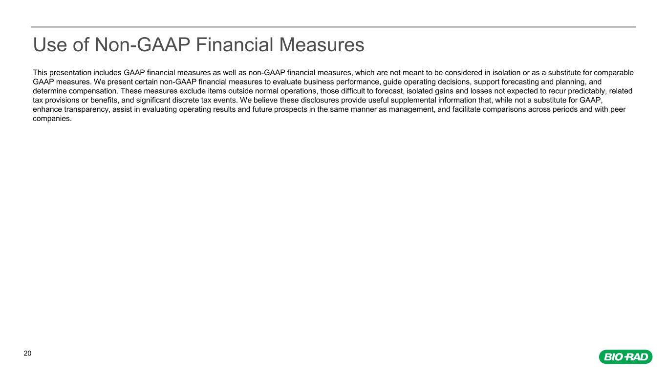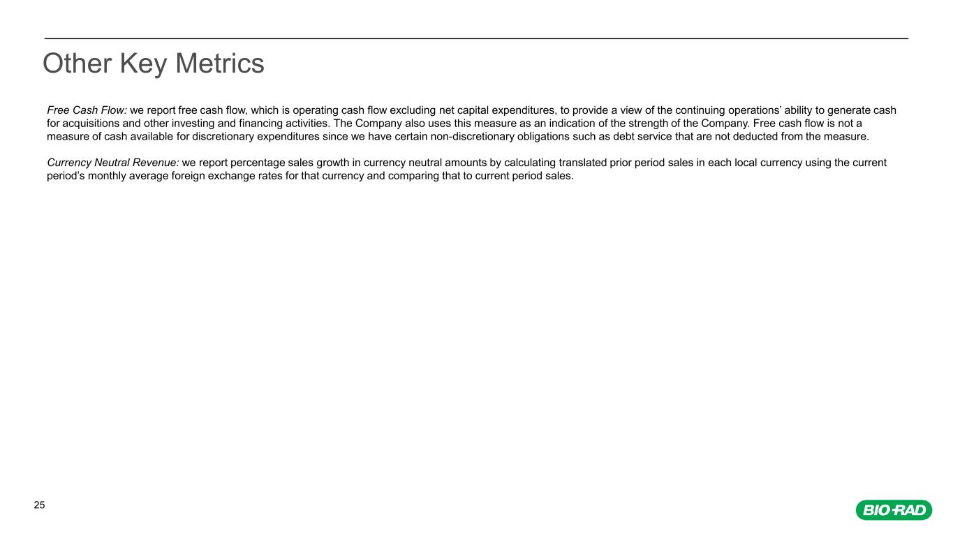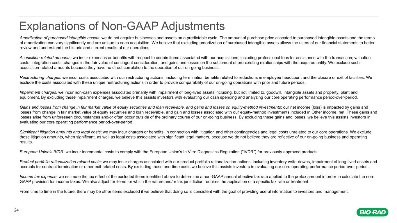 24 Explanations of Non-GAAP Adjustments Amortization of purchased intangible assets: we do not acquire businesses and assets on a predictable cycle. The amount of purchase price allocated to purchased intangible assets and the terms of amortization can vary significantly and are unique to each acquisition. We believe that excluding amortization of purchased intangible assets allows the users of our financial statements to better review and understand the historic and current results of our operations. Acquisition-related amounts: we incur expenses or benefits with respect to certain items associated with our acquisitions, including professional fees for assistance with the transaction; valuation costs, integration costs, changes in the fair value of contingent consideration, and gains and losses on the settlement of pre-existing relationships with the acquired entity. We exclude such acquisition-related amounts because they have no direct correlation to the operation of our on-going business. Restructuring charges: we incur costs associated with our restructuring actions, including termination benefits related to reductions in employee headcount and the closure or exit of facilities. We exclude the costs associated with these unique restructuring actions in order to provide comparability of our on-going operations with prior and future periods. Impairment charges: we incur non-cash expenses associated primarily with impairment of long-lived assets including, but not limited to, goodwill, intangible assets and property, plant and equipment. By excluding these impairment charges, we believe this assists investors with evaluating our cash spending and analyzing our core operating performance period-over-period. Gains and losses from change in fair market value of equity securities and loan receivable, and gains and losses on equity-method investments: our net income (loss) is impacted by gains and losses from change in fair market value of equity securities and loan receivable, and gain and losses associated with our equity-method investments included in Other income, net. These gains and losses arise from unforeseen circumstances and/or often occur outside of the ordinary course of our on-going business. By excluding these gains and losses, we believe this assists investors in evaluating our core operating performance period-over-period. Significant litigation amounts and legal costs: we may incur charges or benefits, in connection with litigation and other contingencies and legal costs unrelated to our core operations. We exclude these litigation amounts, when significant, as well as legal costs associated with significant legal matters, because we do not believe they are reflective of our on-going business and operating results. European Union's IVDR: we incur incremental costs to comply with the European Union's In Vitro Diagnostics Regulation ("IVDR") for previously approved products. Product portfolio rationalization related costs: we may incur charges associated with our product portfolio rationalization actions, including inventory write-downs, impairment of long-lived assets and accruals for contract termination or other exit-related costs. By excluding these one-time costs we believe this assists investors in evaluating our core operating performance period-over-period. Income tax expense: we estimate the tax effect of the excluded items identified above to determine a non-GAAP annual effective tax rate applied to the pretax amount in order to calculate the non- GAAP provision for income taxes. We also adjust for items for which the nature and/or tax jurisdiction requires the application of a specific tax rate or treatment. From time to time in the future, there may be other items excluded if we believe that doing so is consistent with the goal of providing useful information to investors and management.