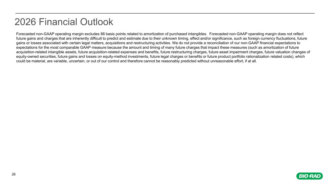 26 2026 Financial Outlook Forecasted non-GAAP operating margin excludes 88 basis points related to amortization of purchased intangibles. Forecasted non-GAAP operating margin does not reflect future gains and charges that are inherently difficult to predict and estimate due to their unknown timing, effect and/or significance, such as foreign currency fluctuations, future gains or losses associated with certain legal matters, acquisitions and restructuring activities. We do not provide a reconciliation of our non-GAAP financial expectations to expectations for the most comparable GAAP measure because the amount and timing of many future charges that impact these measures (such as amortization of future acquisition-related intangible assets, future acquisition-related expenses and benefits, future restructuring charges, future asset impairment charges, future valuation changes of equity-owned securities, future gains and losses on equity-method investments, future legal charges or benefits or future product portfolio rationalization related costs), which could be material, are variable, uncertain, or out of our control and therefore cannot be reasonably predicted without unreasonable effort, if at all.