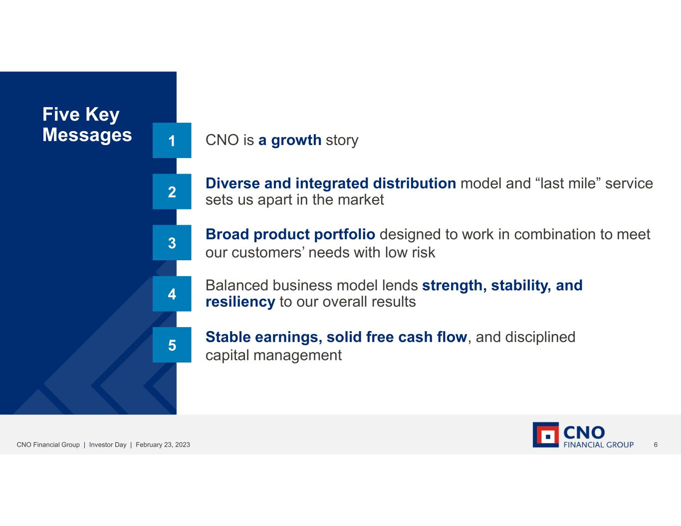 CNO Financial Group | Investor Day | February 23, 2023 5 OpportunityGrowth Differentiation Goals for the Day Learn how our businesses have evolved and what differentiates them Understand our roadmap for growing both the top and bottom line Recognize us as an attractive investment opportunity