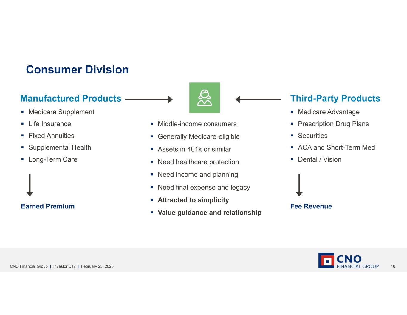 CNO Financial Group | Investor Day | February 23, 2023 9 Consumer Division: Key Takeaways Operate as an integrated distribution platform Strong and growing direct-to-consumer franchise Exclusive field force that builds enduring relationships3 2 1