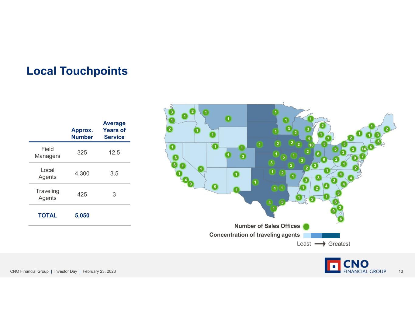 CNO Financial Group | Investor Day | February 23, 2023 12 1 Based on company research of carrier-owned direct-to-consumer programs  Well-known brand  Top 5 direct-to-consumer life insurer 1  Sales made online, over-the-phone by employees, and via third-party partners  Manage spend against target IRR  Source of leads for Bankers Life field agents Direct Sales $77 $93 $108 $119 2019 2020 2021 2022 New Annual Premium (in millions)
