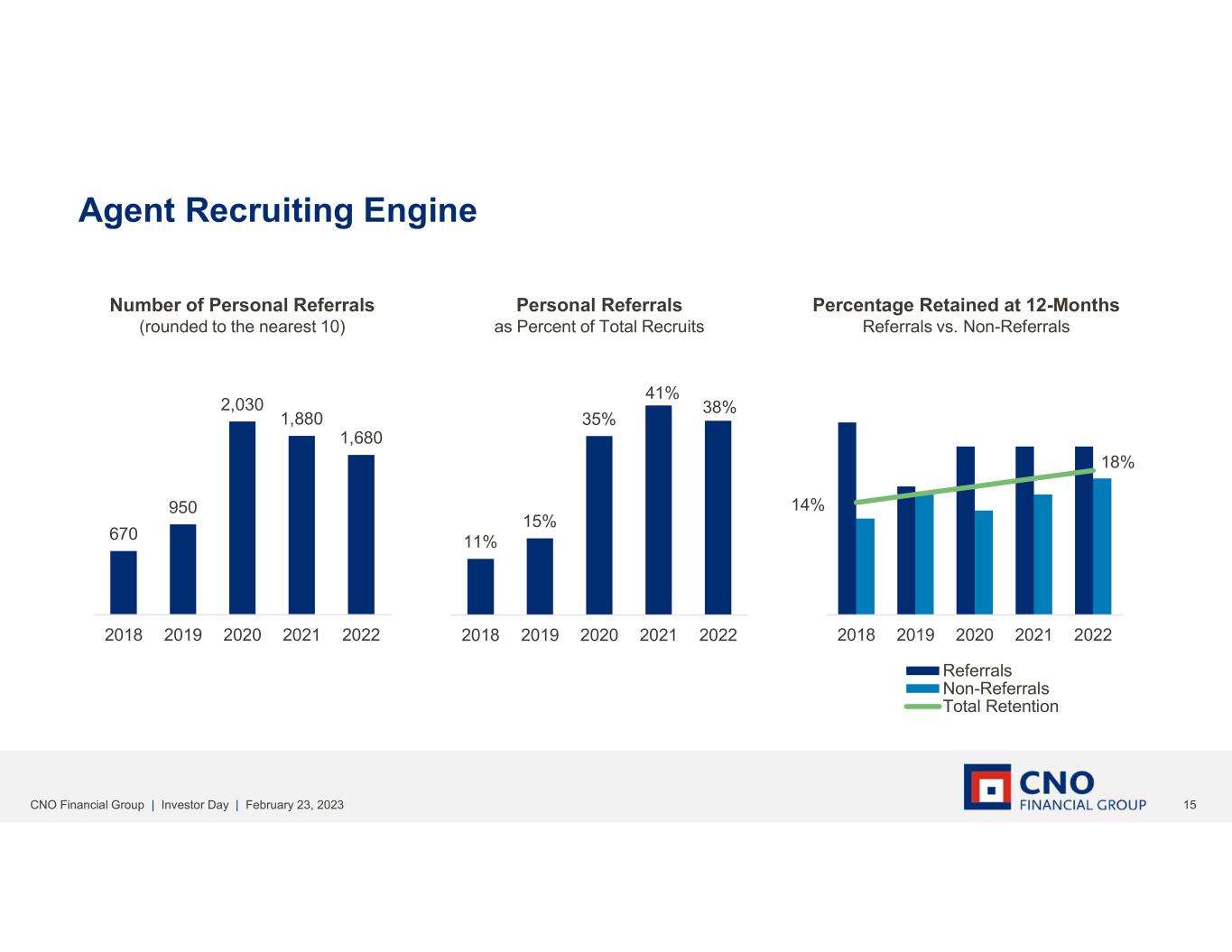 CNO Financial Group | Investor Day | February 23, 2023 14 Loyal and Vibrant Professionals 0 500 1,000 1,500 2,000 2,500 3,000 3,500 4,000 4,500 5,000 2017 2018 2019 2020 2021 2022 Experienced Agents First-Year Agents Average Producing Agent Count, Q4 Agents by Age Cohort Majority of agents are under 40 years old 20% 37% 26% 17% Boomers (1946-1964) Gen Z (2000-2012) Millennials (1981-1999) Gen X (1965-1980)